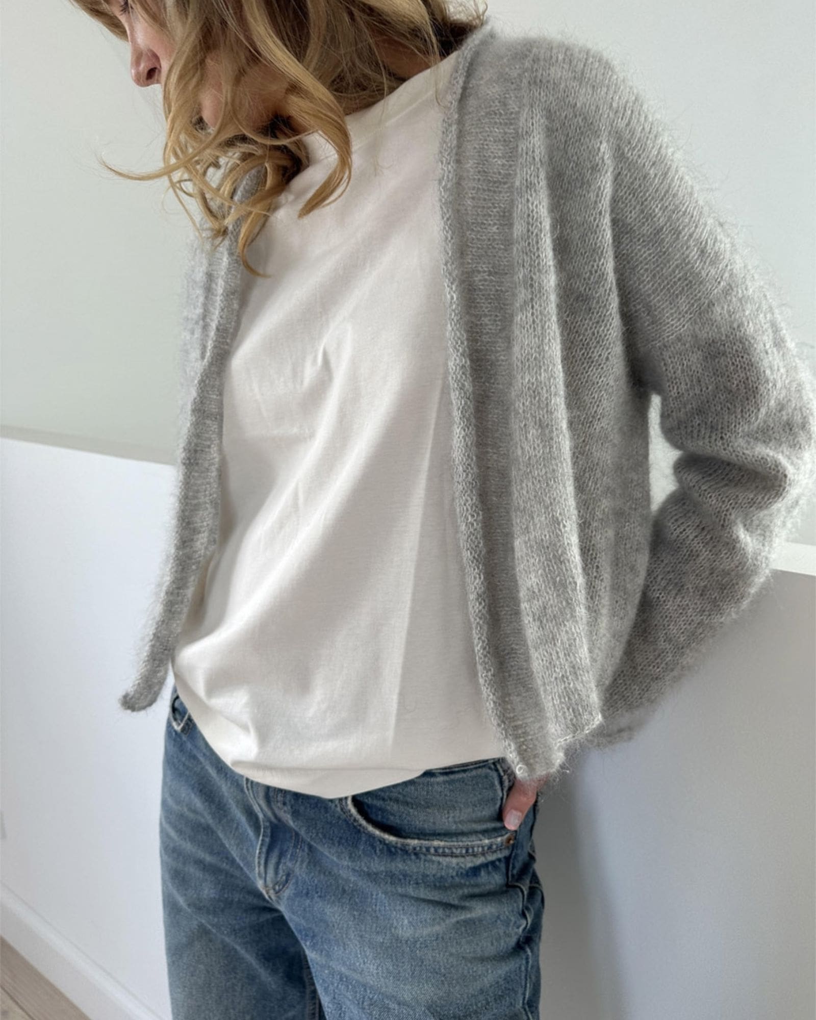 Den lysegrå Plain Cardigan Light er strikket i Sandnes Tynn Silk Mohair i fv. 1022 Lys Gråmeleret.