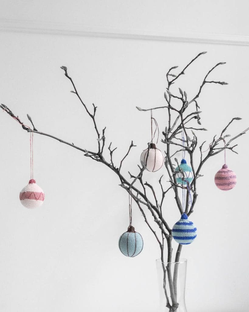 Du kan vælge mellem tre forskellige styles i opskriften. Leg med farverne og julekuglerne får et helt nyt udtryk. Her er julekuglerne hængt op på en fin magnoliagren, hvor de pynter så flot på spisebordet.