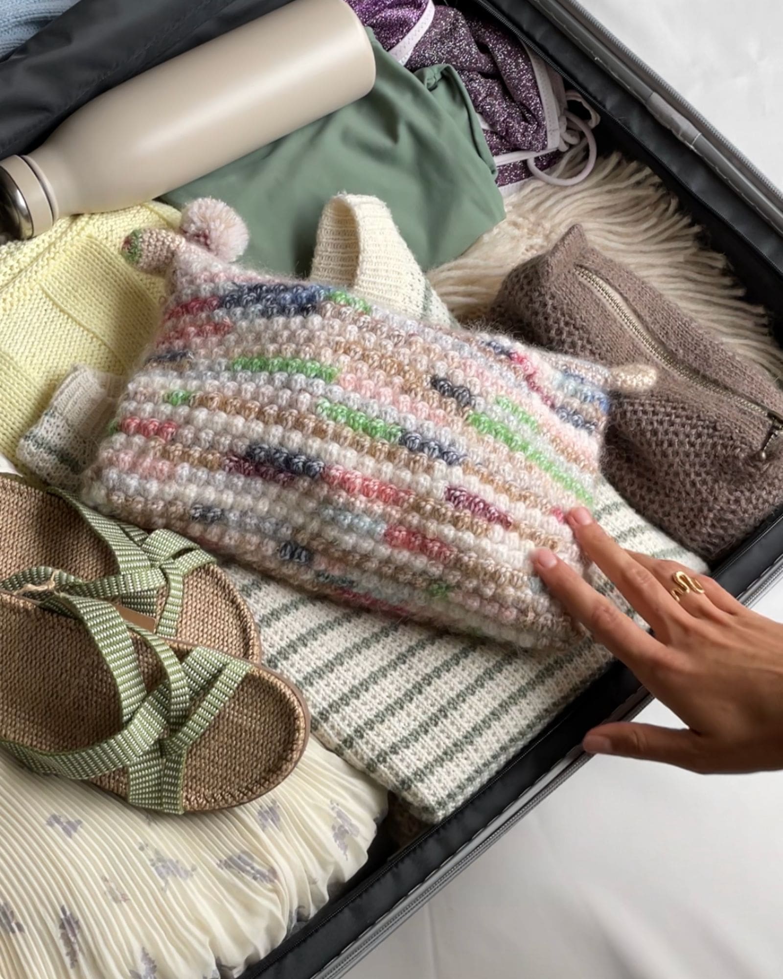 Projekttasker af stof, er nemme at pakke ned i kufferten, da de kan forme sig efter kuffertens indhold og dermed fylder mindre. Samtidig er en projekttaske super nem at have med ved siden af standstolen, så du kan opbevare dine garnnøgler deri, mens du ligger og strikker i vandkanten og nyder bølgeskvulpene.