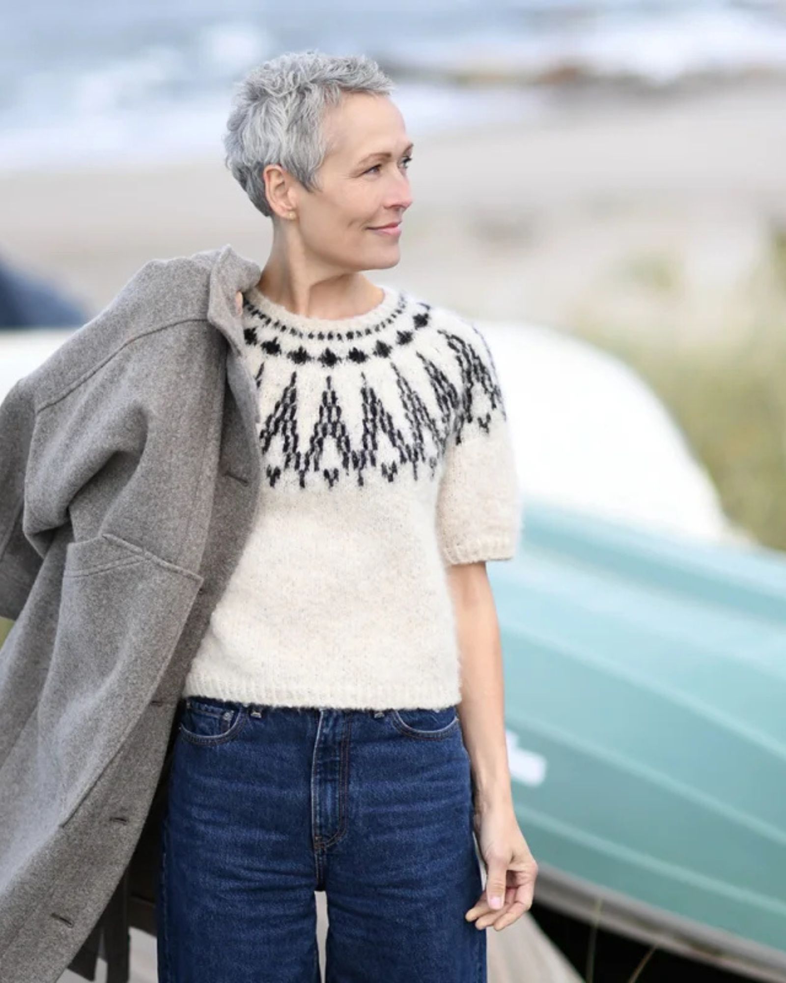 Anne har strikket Aluna Sweater med korte ærmer, men i opskriften finder du også en beskrivelse af, hvordan du strikker sweateren med lange ærmer.