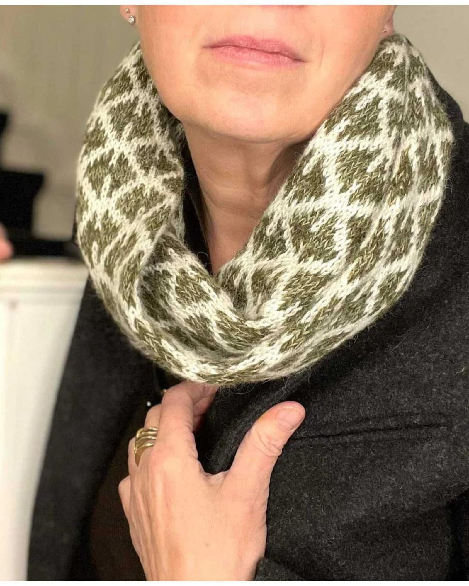 Mønsterfarve: 100 g Spinni farve 15s holdt sammen med 50 g Alpaca 1 fv. Thyme.