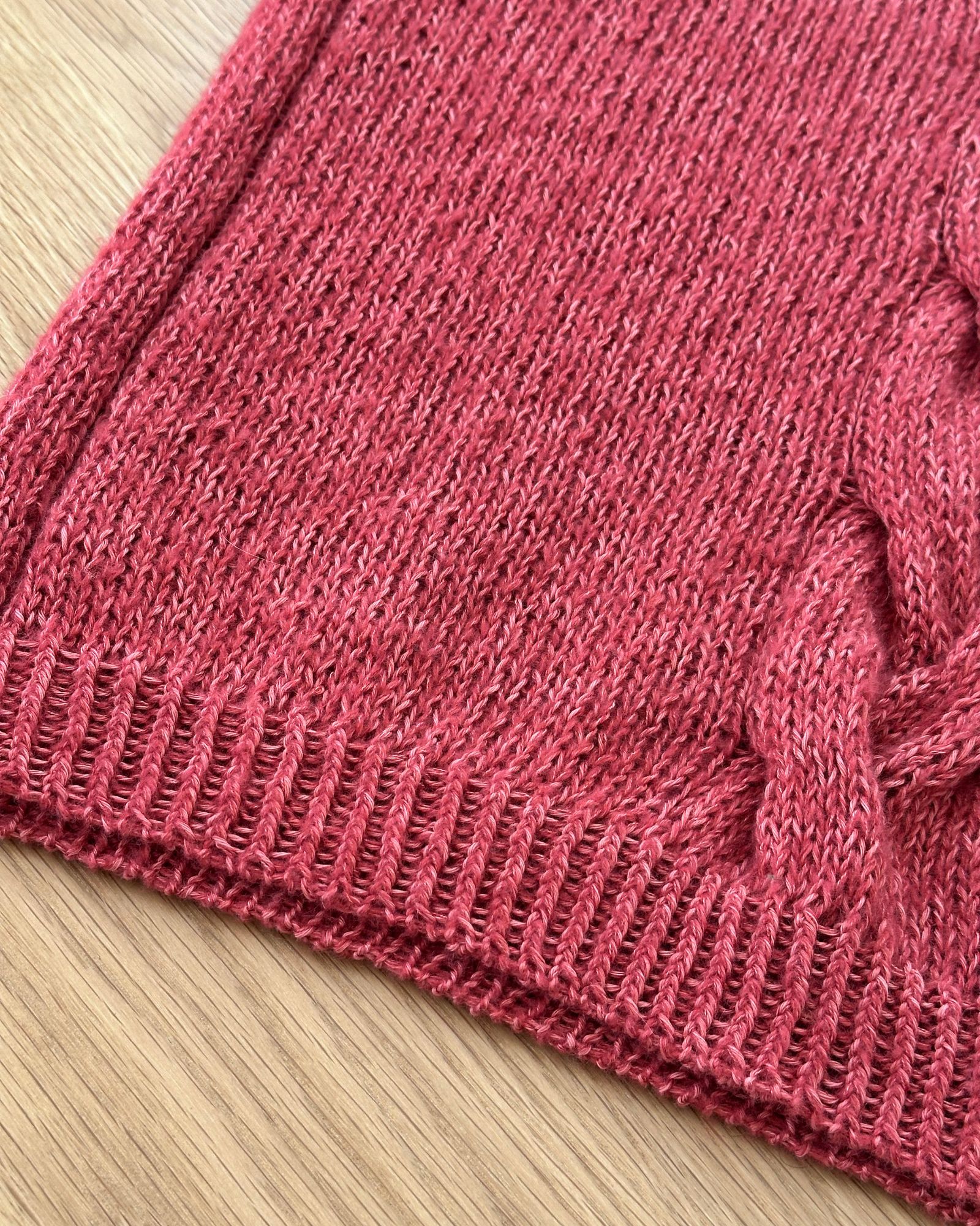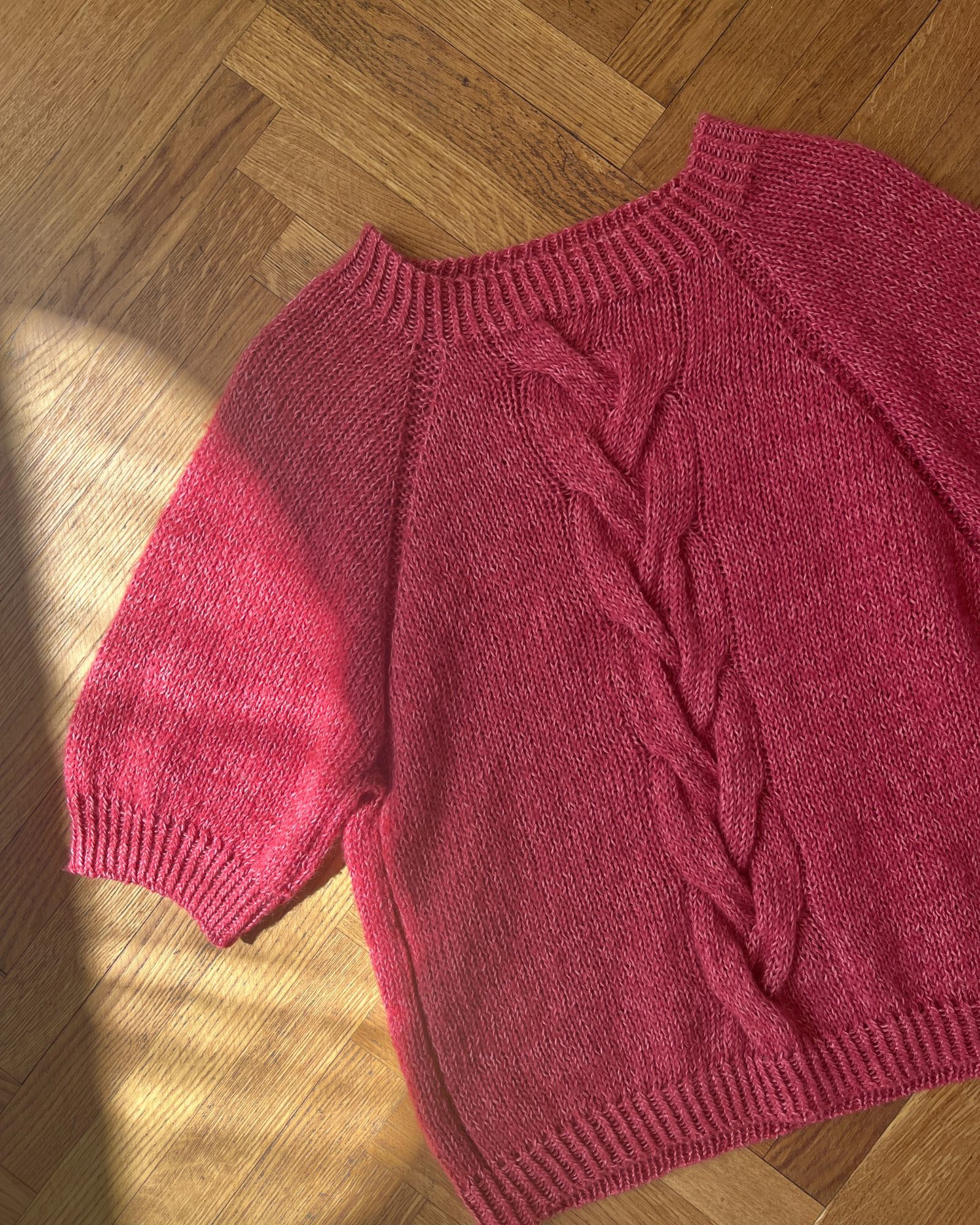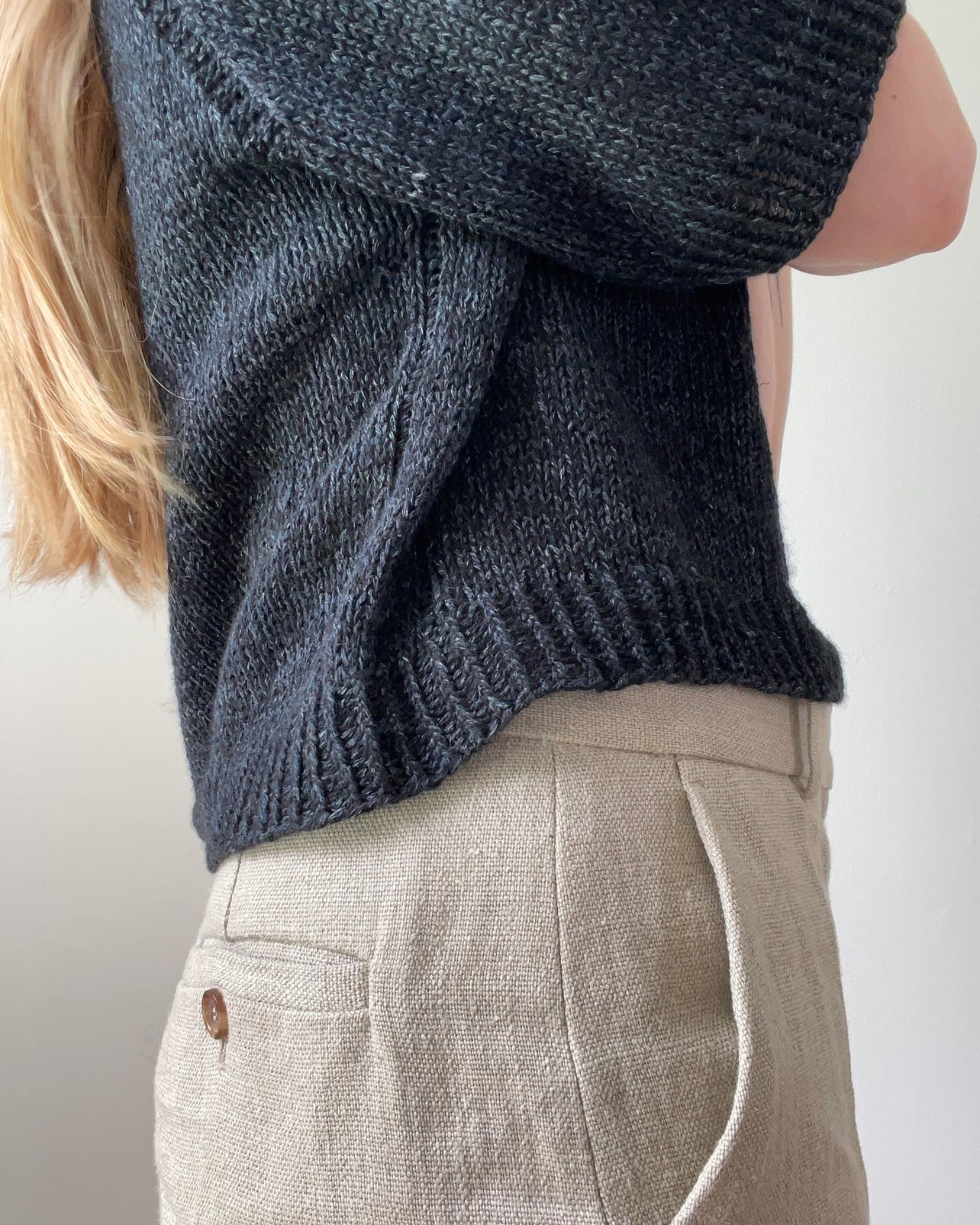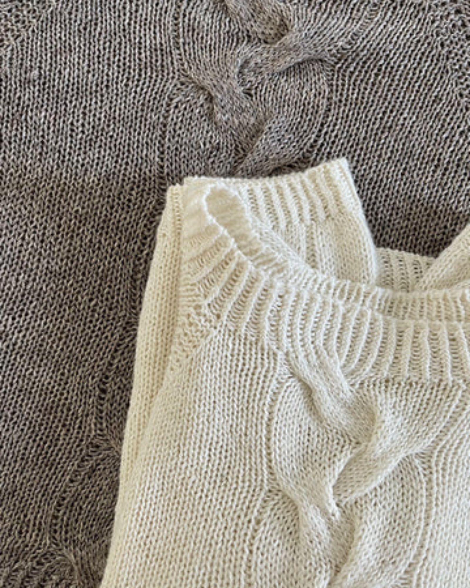 Garnet i dette kit er et garnalternativ til originalgarnet, og udtrykket på det færdige resultat kan derfor variere. I dette kit benyttes én tråd Trio 2 fra Isager, som er en god sommergarn bestående af 50% hør, 30% bomuld og 20% lyocell. Den strikkes sammen med én tråd North fra Tante Grøn, der er en ultrablød og eksklusiv følgetråd, der består af 50% fin merinould, 30% silke og 20% cashmere.