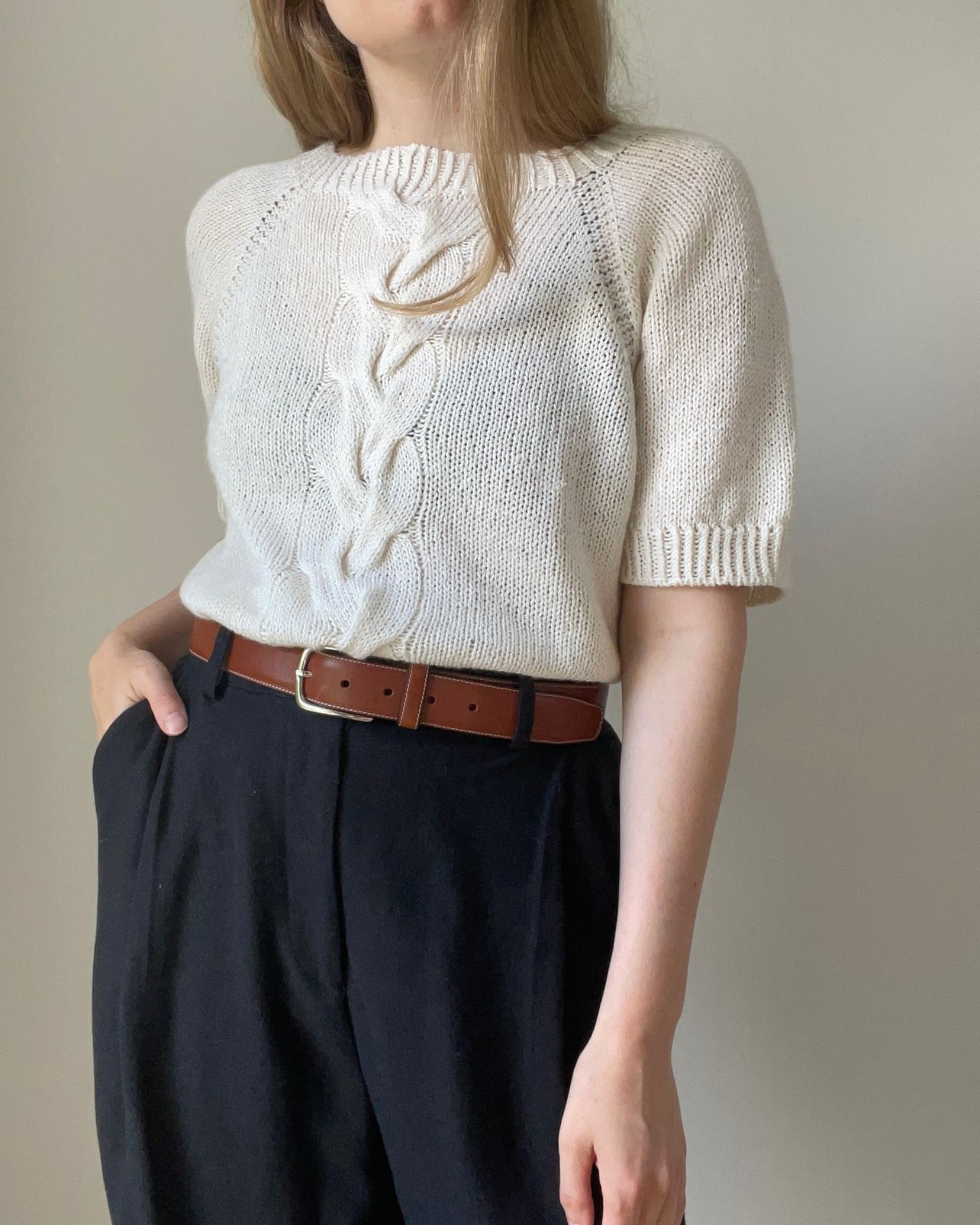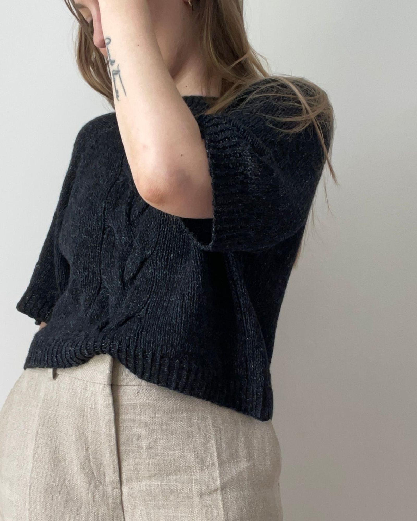 Busan tee er en luftig og draperet t-shirt som kan bruges hele sommeren. Tee’en er forholdsvis kort og boxy i sin pasform, helt perfekt til en højttaljet nederdel eller denim shorts. Busan tee er som sweater-versionen kendetegnet ved den store signatur snoning på forstykket, og vrangmasker ved raglan-udtagningerne som fortsætter ned på kroppen og på ærmerne.