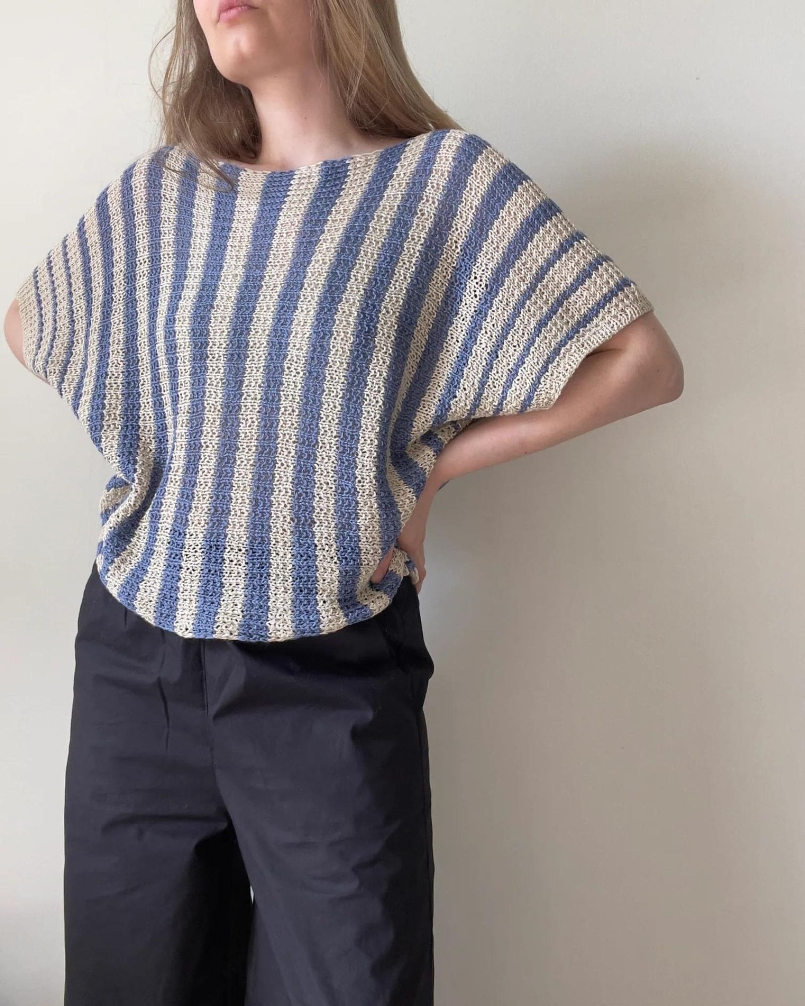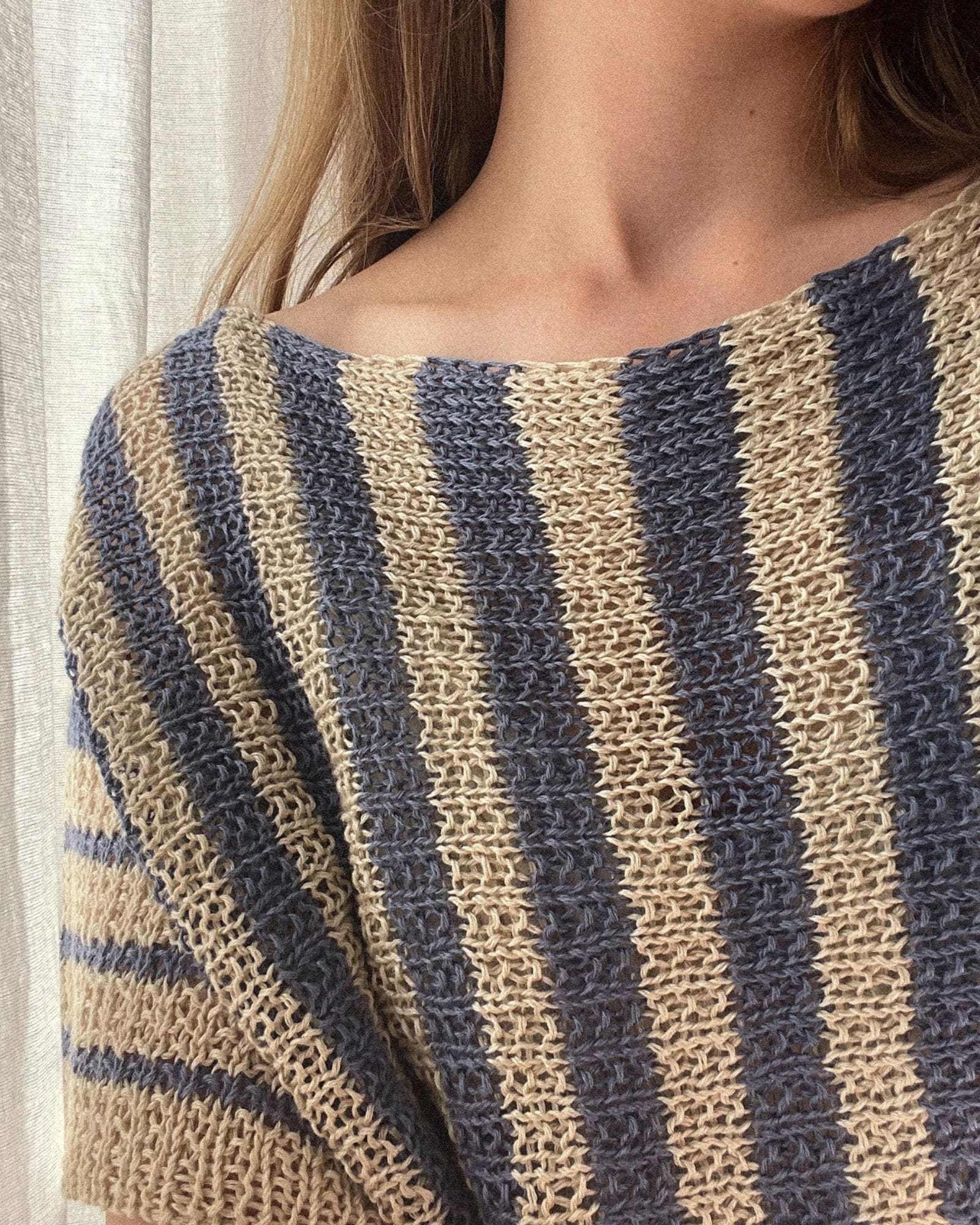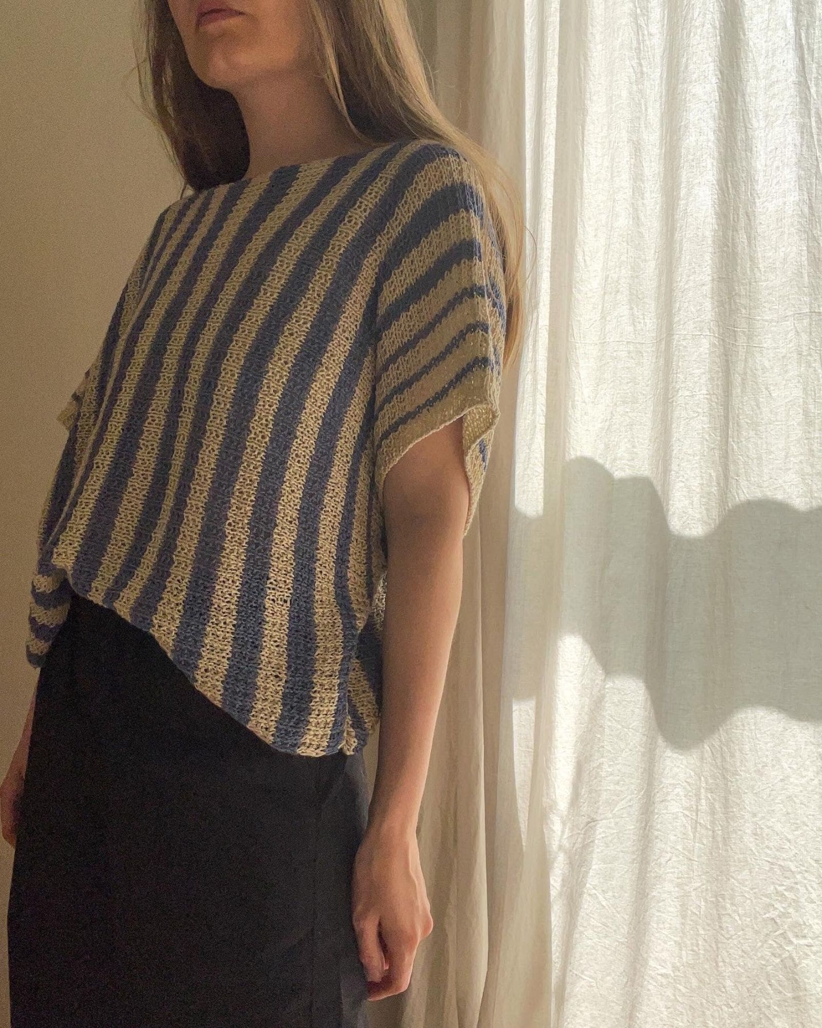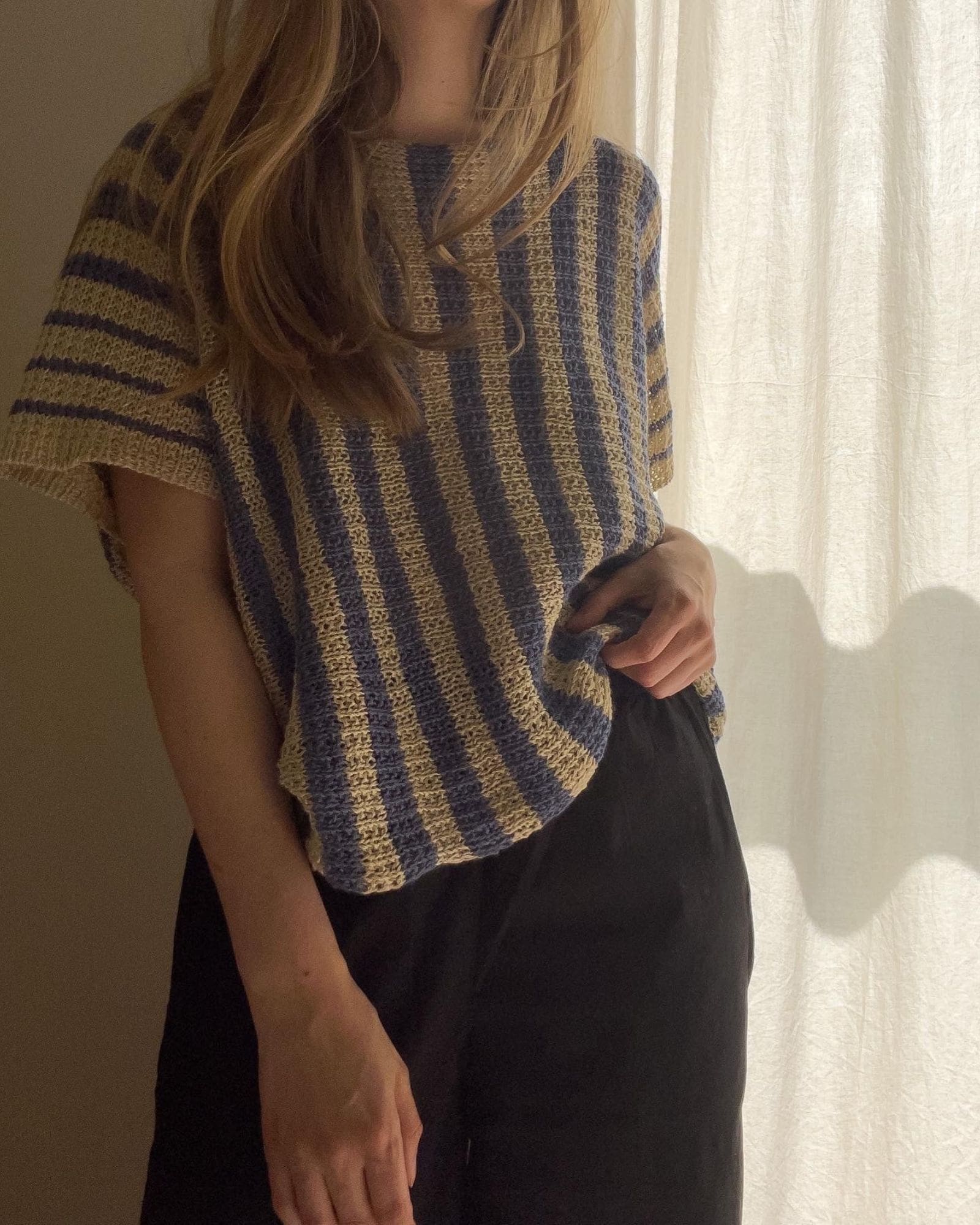 Hae tee er en cropped og feminin t-shirt med lodrette striber der strikkes i brudt ribstruktur, der bidrager til et klassisk udtryk. Tee’en strikkes fra ærme- til ærme og syes til sidst sammen i siderne, opskriften kommer derudover med en større størrelsesguide og illustrationer.