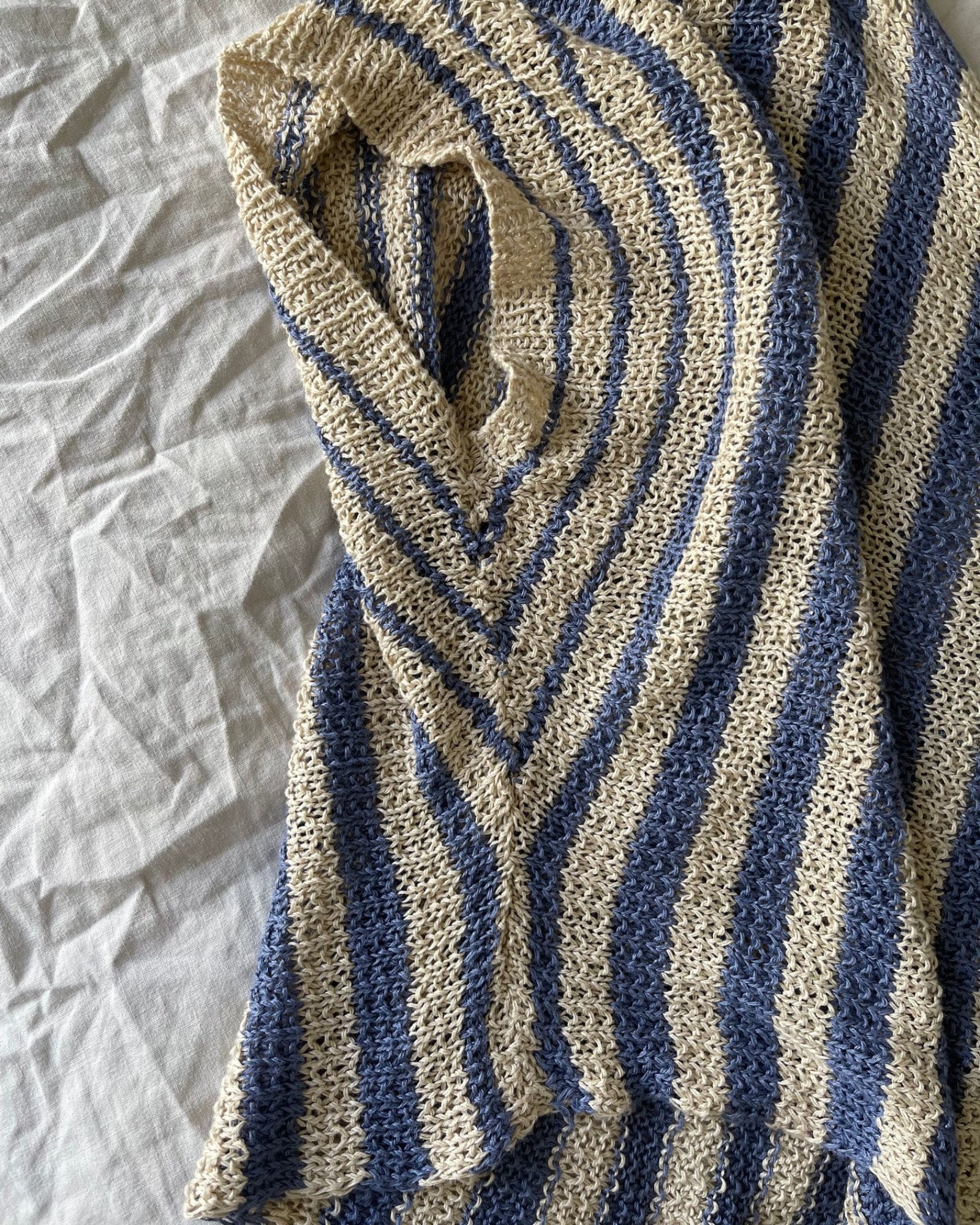 Hae tee på billederne er strikket i bundfarve fv. linen og striber/kontrastfarver i fv. sky.