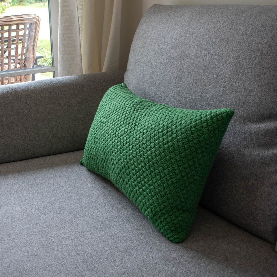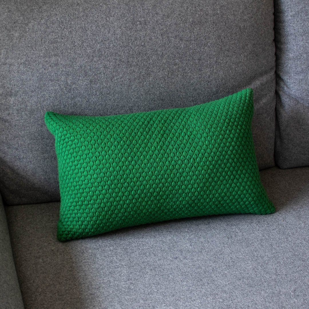 Det kunne da godt ligne ærter, men det er de klassiske sømandsbobler, der er baggrunden for denne pude. Den strikkes i Bøllefrø merinould og fåes i mange farver. Puden er strikket i farve 22 Eng. Der strikkes på den lange led af puden og videre ned over bagstykket.