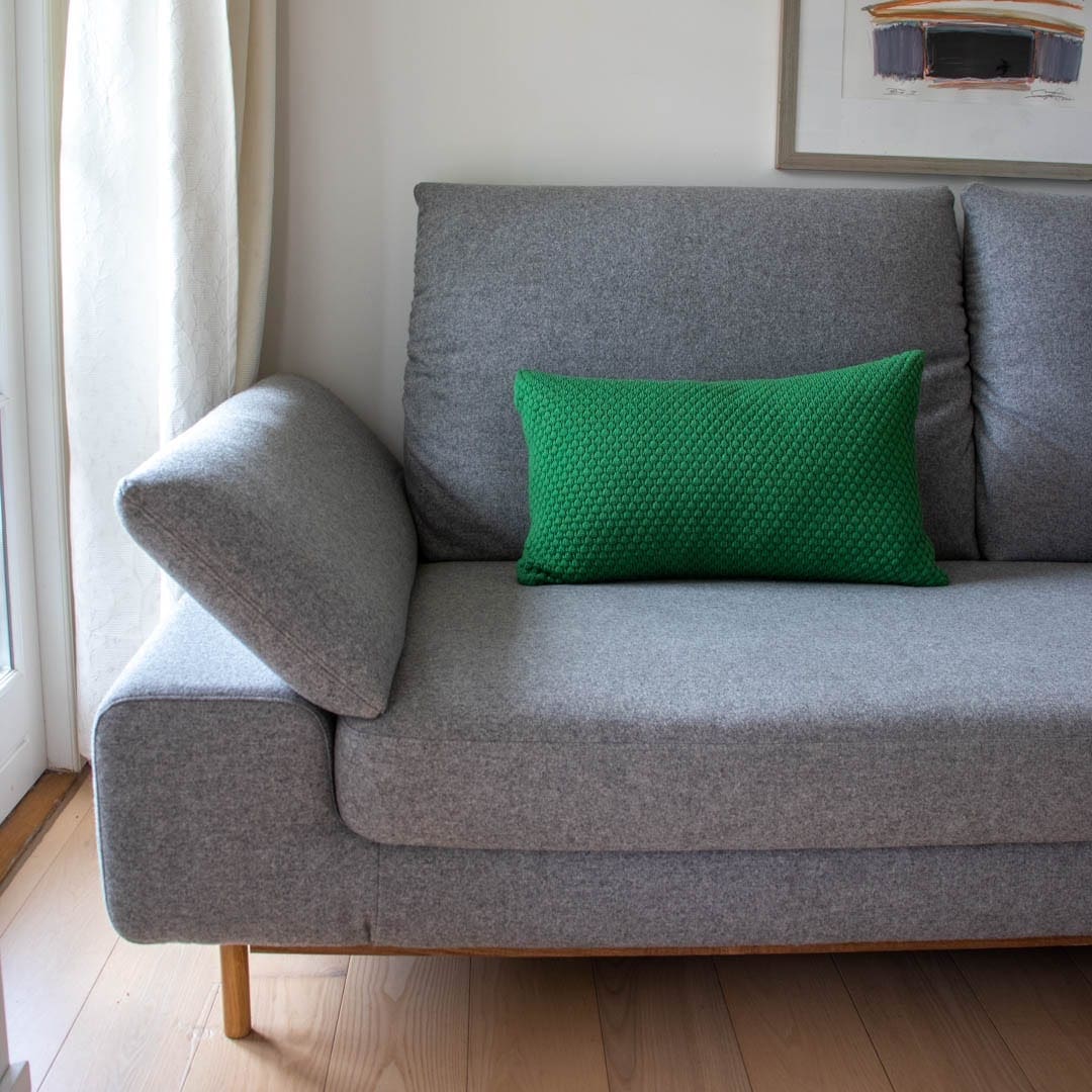 Det kunne da godt ligne ærter, men det er de klassiske sømandsbobler, der er baggrunden for denne pude. Den strikkes i Bøllefrø merinould og fåes i mange farver. Puden er strikket i farve 22 Eng. Der strikkes på den lange led af puden og videre ned over bagstykket.