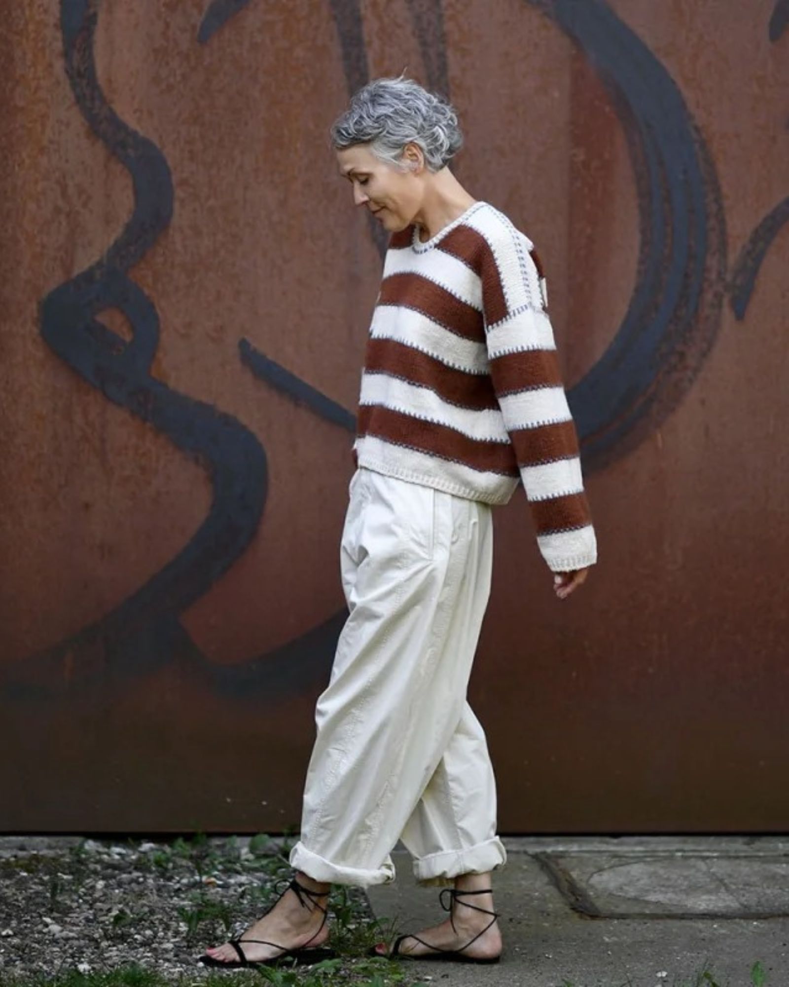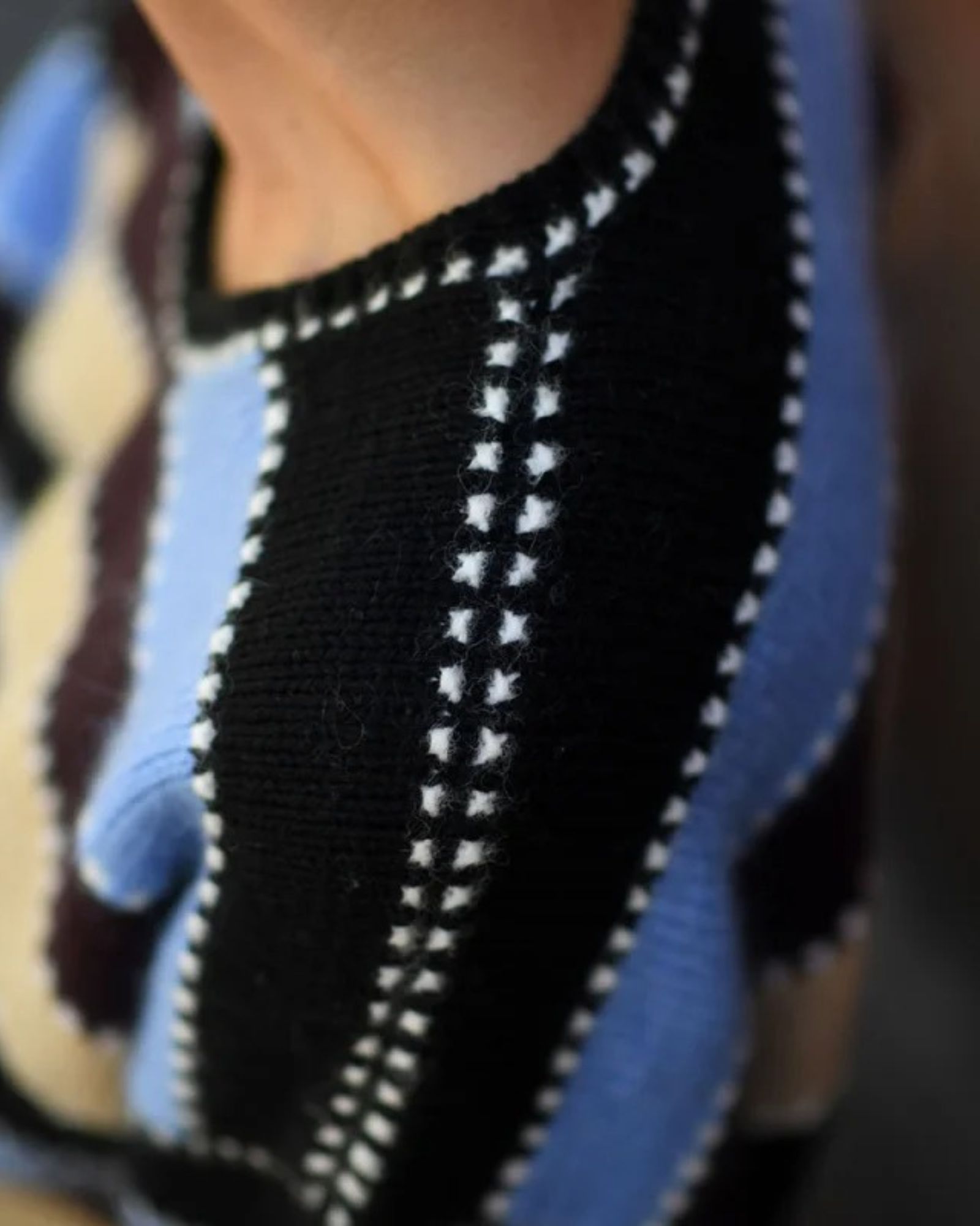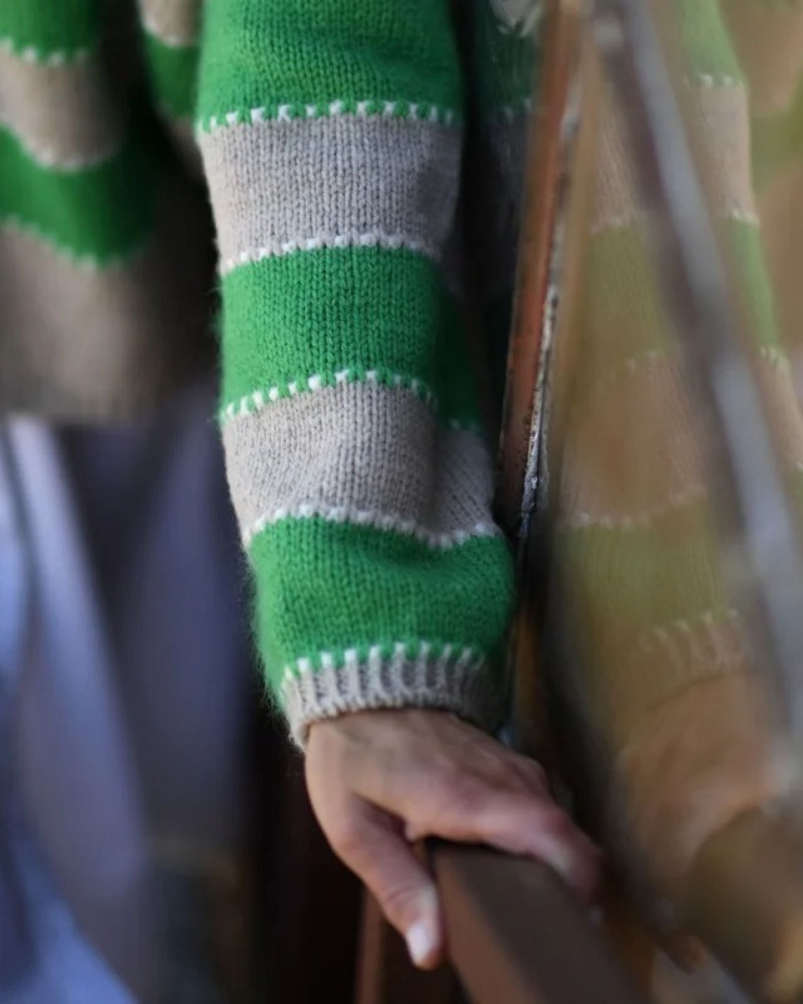 Mimi Sweater fra Anne Ventzel er en rummelig sweater med karakteristiske blokstriber. De brede blokstriber adskilles af elegante prik-linjer, som også strikkes langs skuldre, ærmegab og halskant. Priklinjerne er strikket i vævestrik, som er en enkel teknik, der gør det muligt at strikke et flerfarvet mønster, med blot én farve ad gangen.