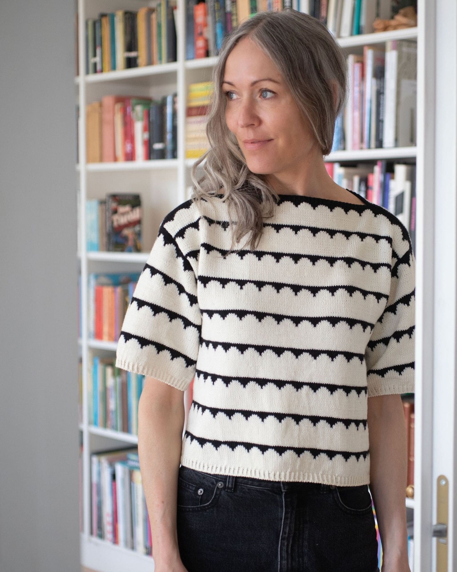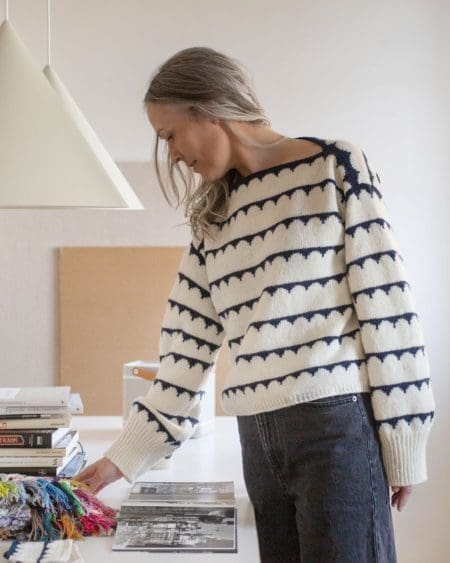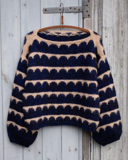 Robinia Tee er en enkelt t-shirt top med et elegant mønster strikket i flerfarvestrik. Toppen strikkes oppefra og ned. Først strikkes frem og tilbage over forstykke og ryg, og derefter samles de to dele til kroppen, som strikkes rundt. Der strikkes masker op til ærme, som afsluttes med en kant i drejet rib. Både på forstykke, ryg og ærme strikkes vendepinde, hvilket giver toppen en rigtig god pasform.