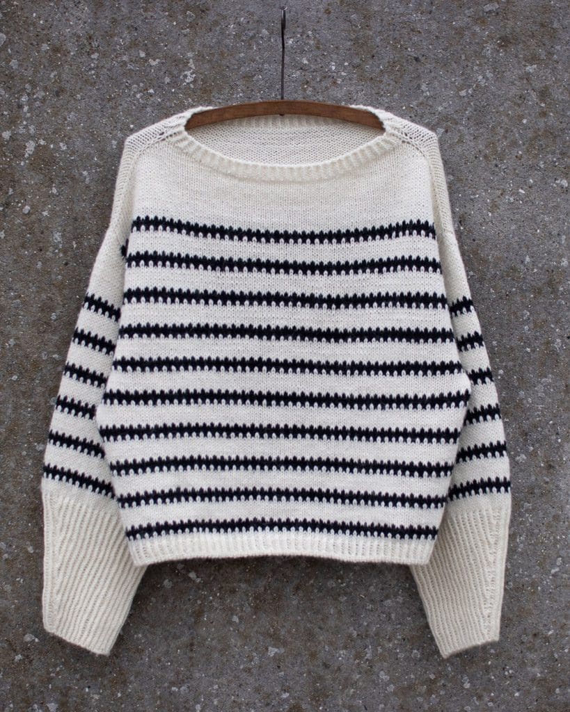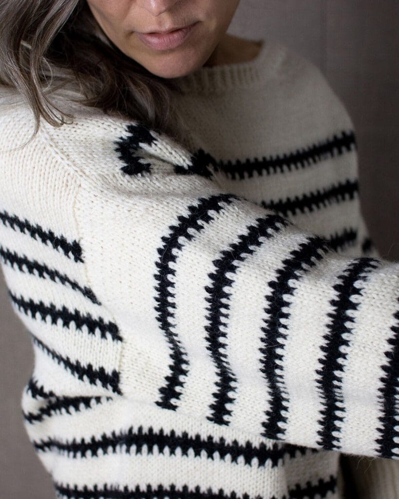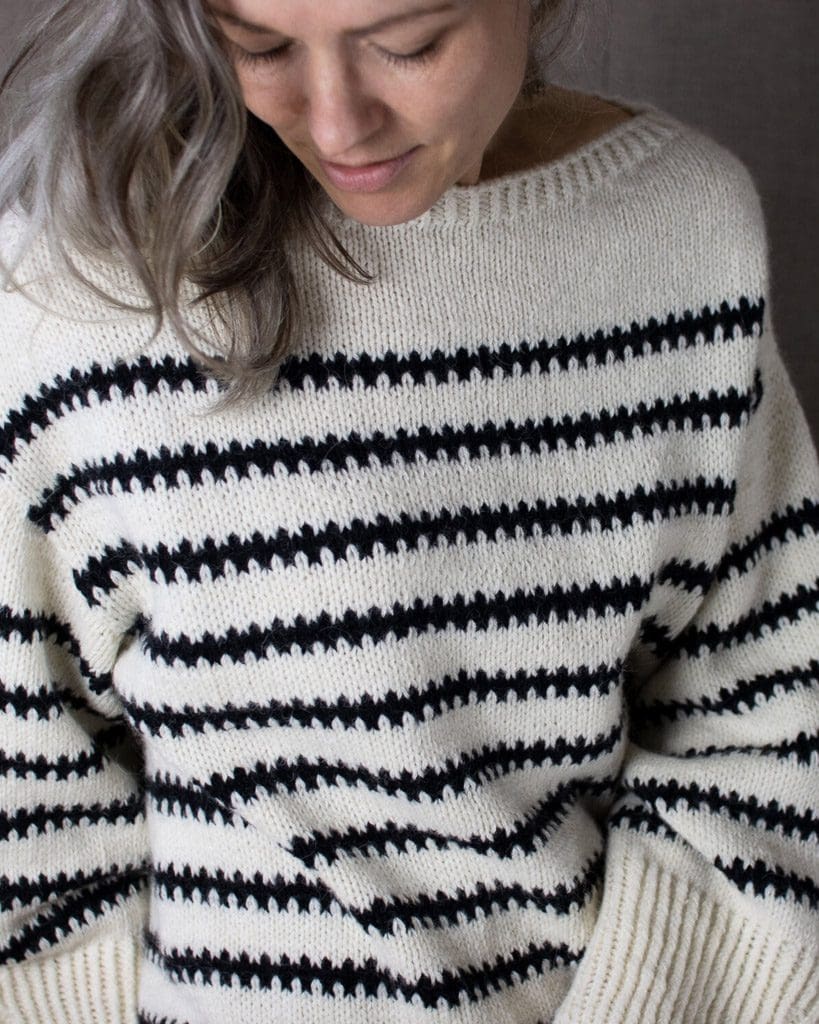 Sailor Sweater har en enkel facon med en fremadskudt skulderlinje og en markant indtagningsdetalje ved ærmets ribkant. Sweateren strikkes oppefra og ned. Først strikkes halsribben rundt, så strikkes der vendepinde for at forme halsudskæringen, hvorefter der igen strikkes rundt til skulderens bredde er nået. Så deles arbejdet i forstykke og ryg og hver del strikkes for sig til ærmegabets bund. Derefter samles delene igen, og kroppen strikkes rundt til nederste kant. Der strikkes nye masker op langs ærmegabet til ærmet, hvorefter der strikkes vendepinde for at forme ærmekuplen. Herefter strikkes ærmet rundt på rundpind og afsluttes med en bred rib med indtagninger langs ydersiden.