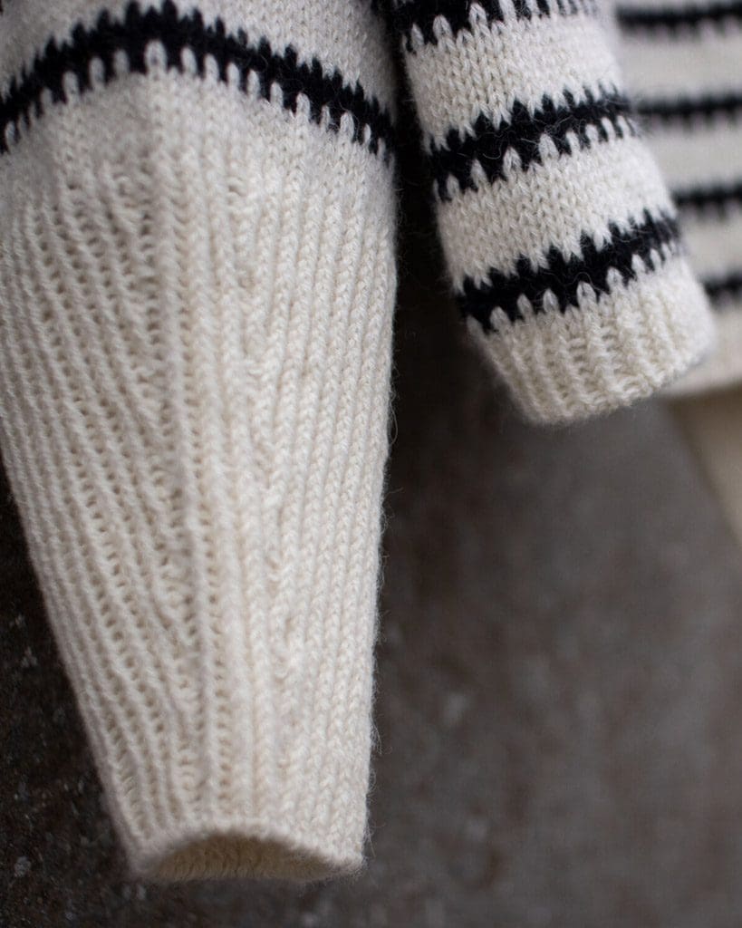 Vær opmærksom på at strikkefastheden kan have en tendens til at blive lidt strammere når man strikker med to farver. Gå evt. en halv pindestørrelse op.