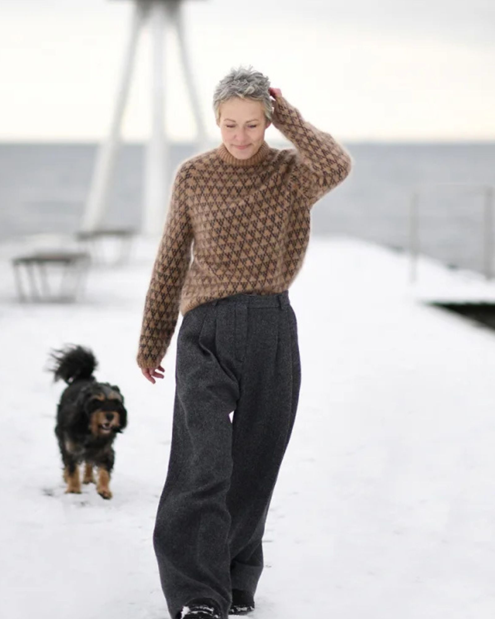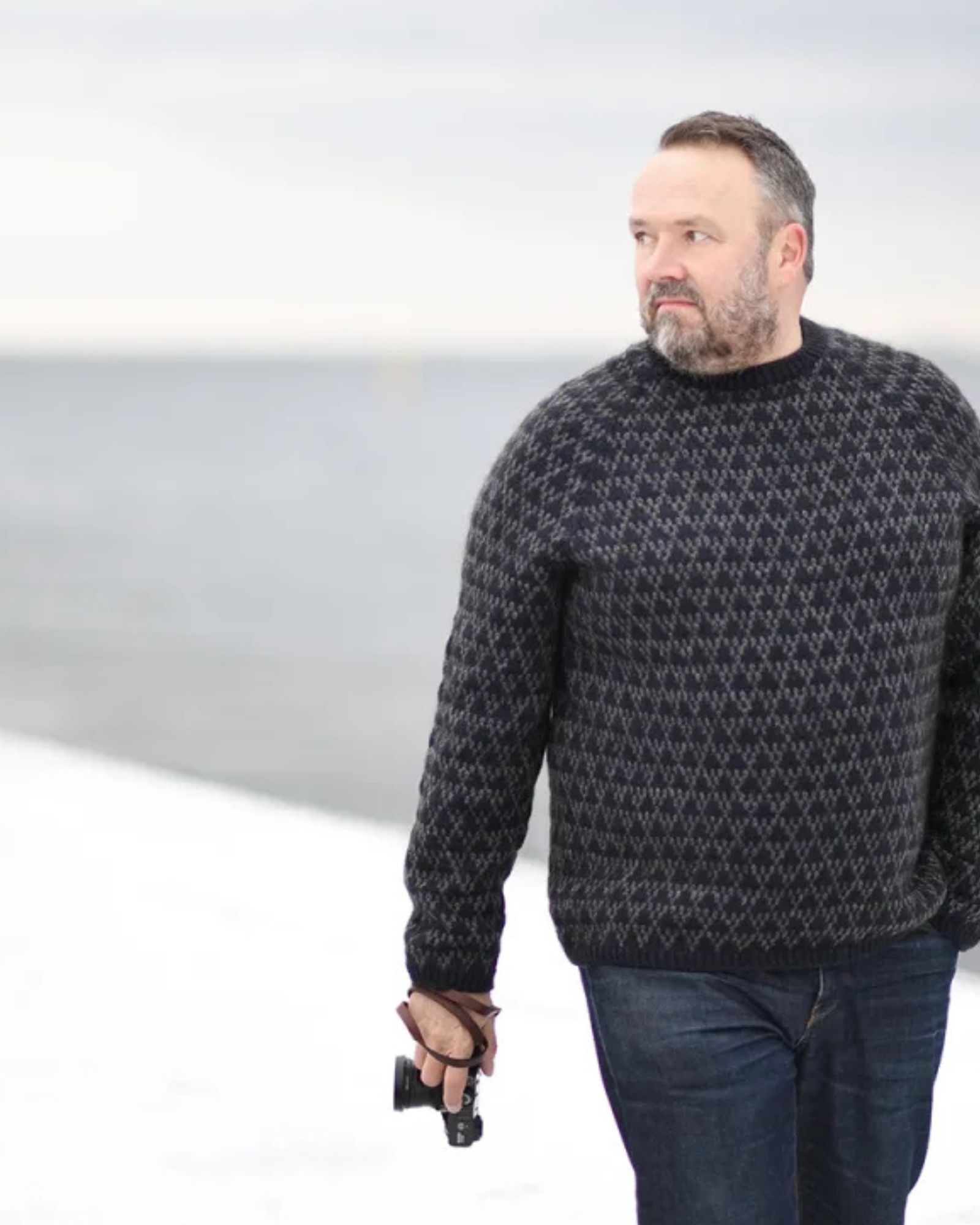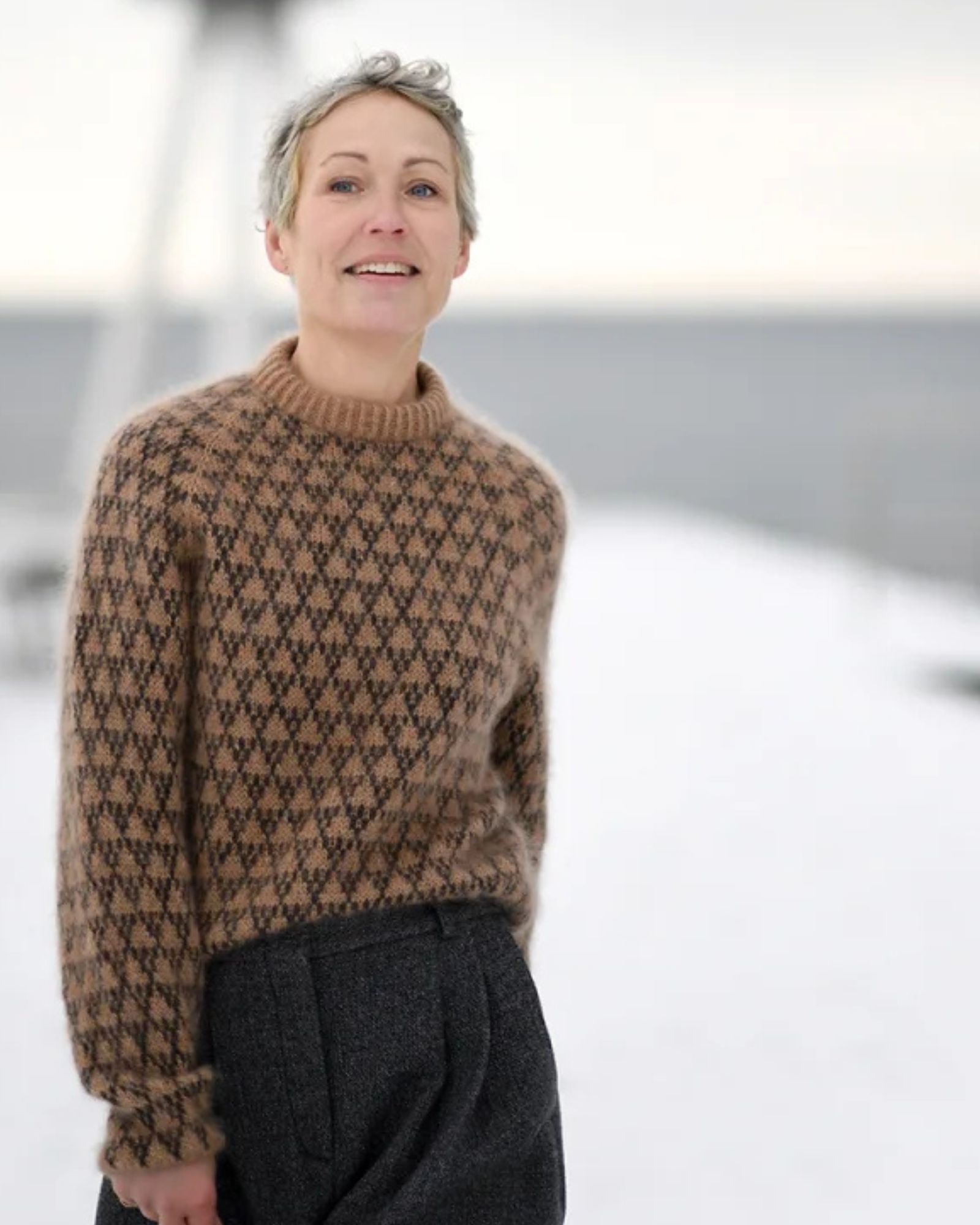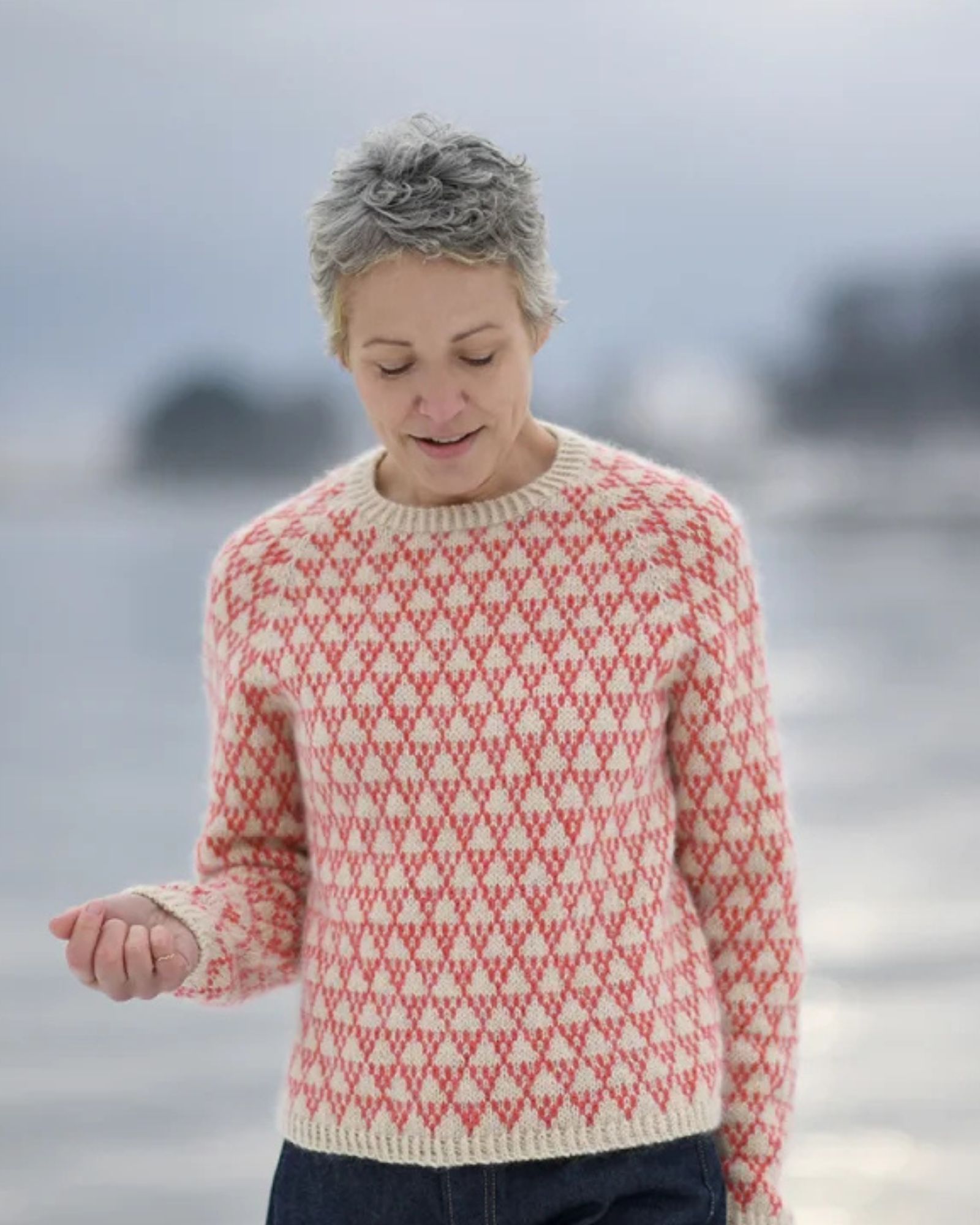 Sweateren strikkes oppefra og ned. Første del af bærestykket strikkes frem og tilbage, mens halsudskæringen dannes. Herefter strikkes der rundt ned over bærestykke, krop og ærmer.