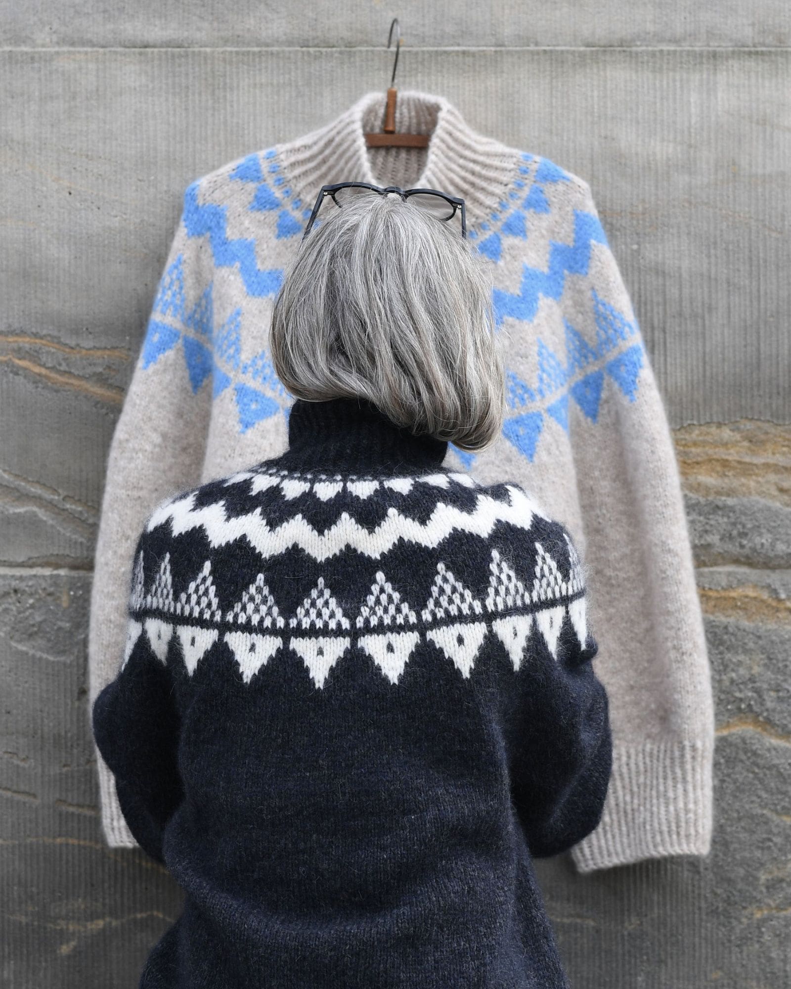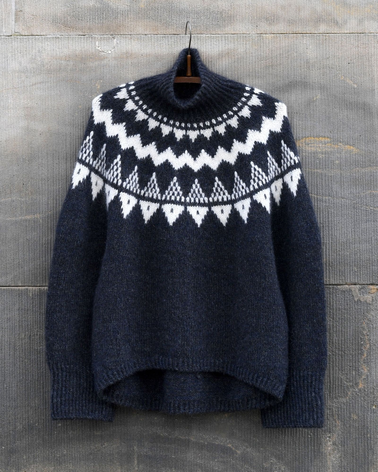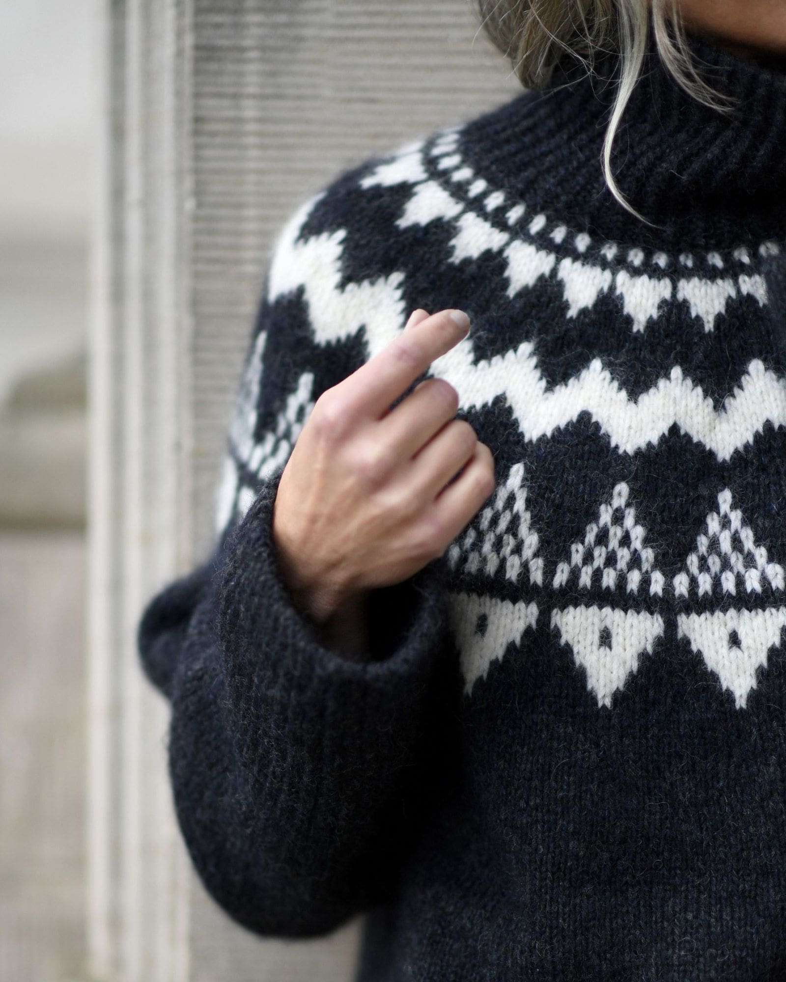 Super Selene er en blød og rummelig sweater med et fremtrædende mønster over bærestykket. Der slås op med italiensk opslag og strikkes en halskant i drejet rib. Derefter strikkes flerfarvestrik ned over bærestykket. For at skabe rummelighed og god pasform over ryggen, strikkes der vendepinde inden arbejdet deles til ærmer og krop.