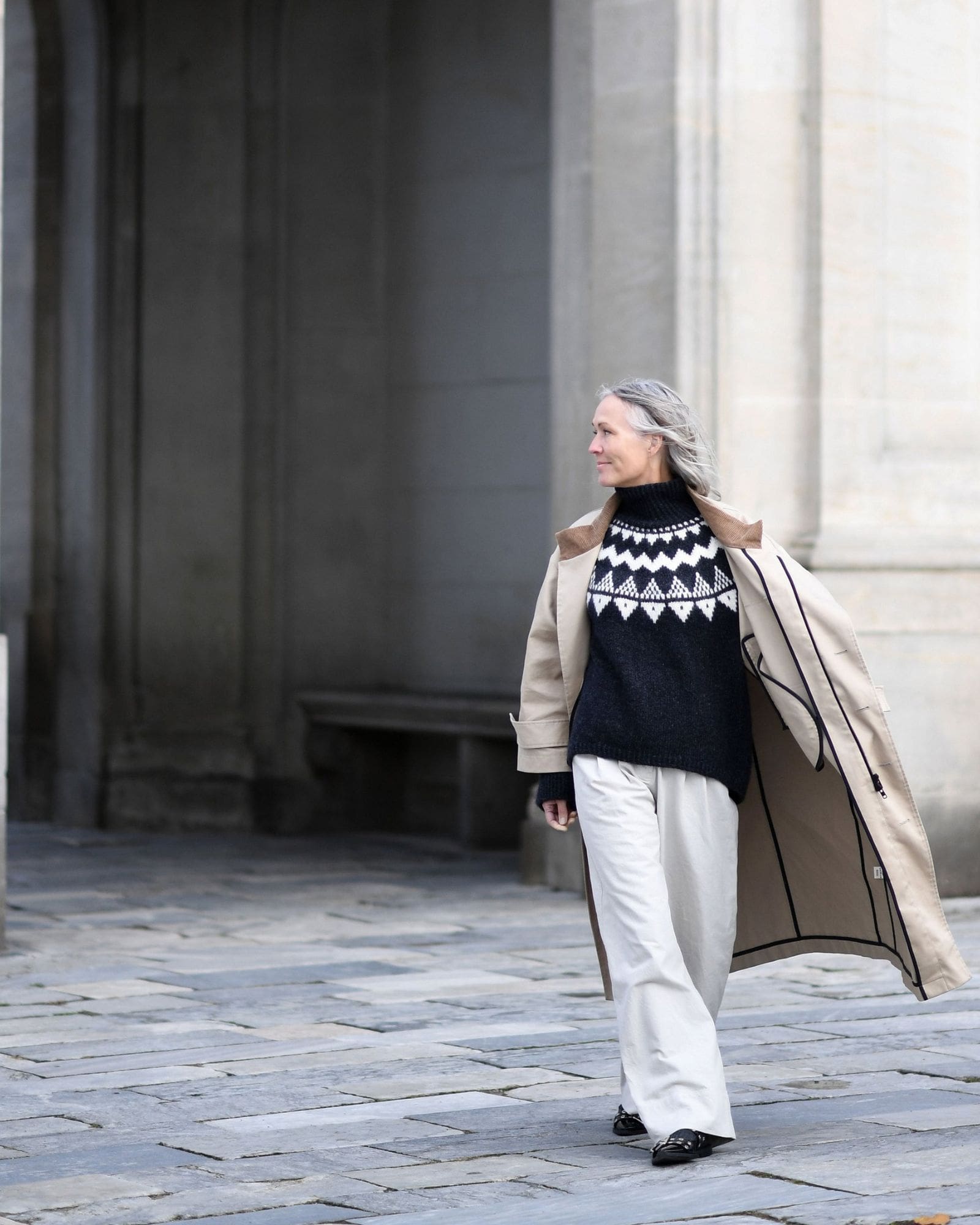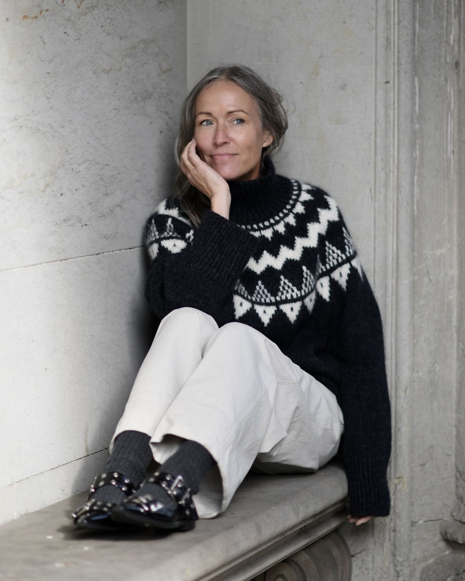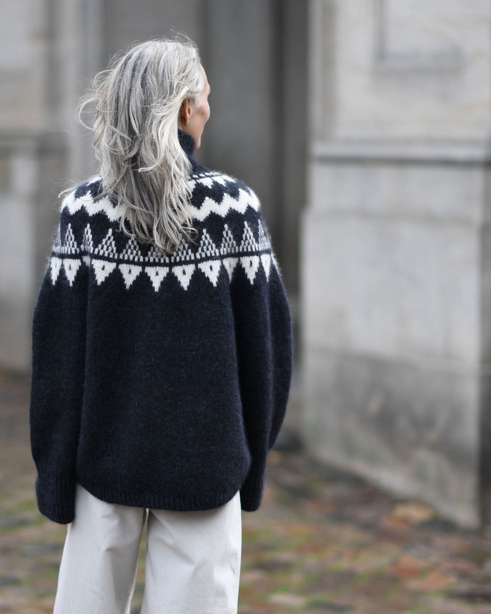 Super Selene er en blød og rummelig sweater med et fremtrædende mønster over bærestykket. Der slås op med italiensk opslag og strikkes en halskant i drejet rib. Derefter strikkes flerfarvestrik ned over bærestykket. For at skabe rummelighed og god pasform over ryggen, strikkes der vendepinde inden arbejdet deles til ærmer og krop.