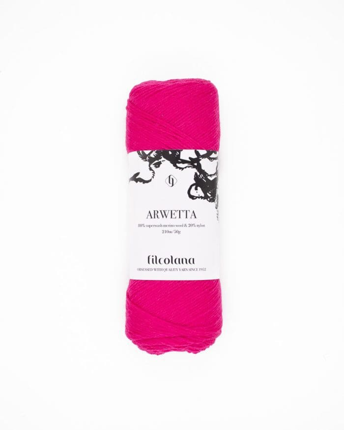 Arwetta fra Filcolana er en blød 4-trådet strømpegarn, som består af 80% Merinould og 20% Nylon.