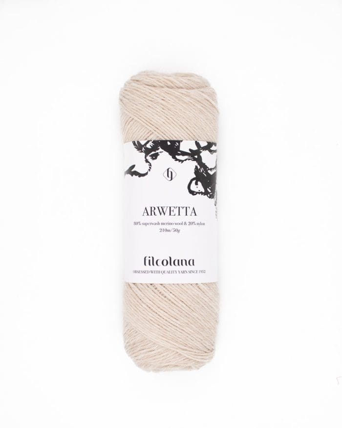 Arwetta fra Filcolana er en blød 4-trådet strømpegarn, som består af 80% Merinould og 20% Nylon.
