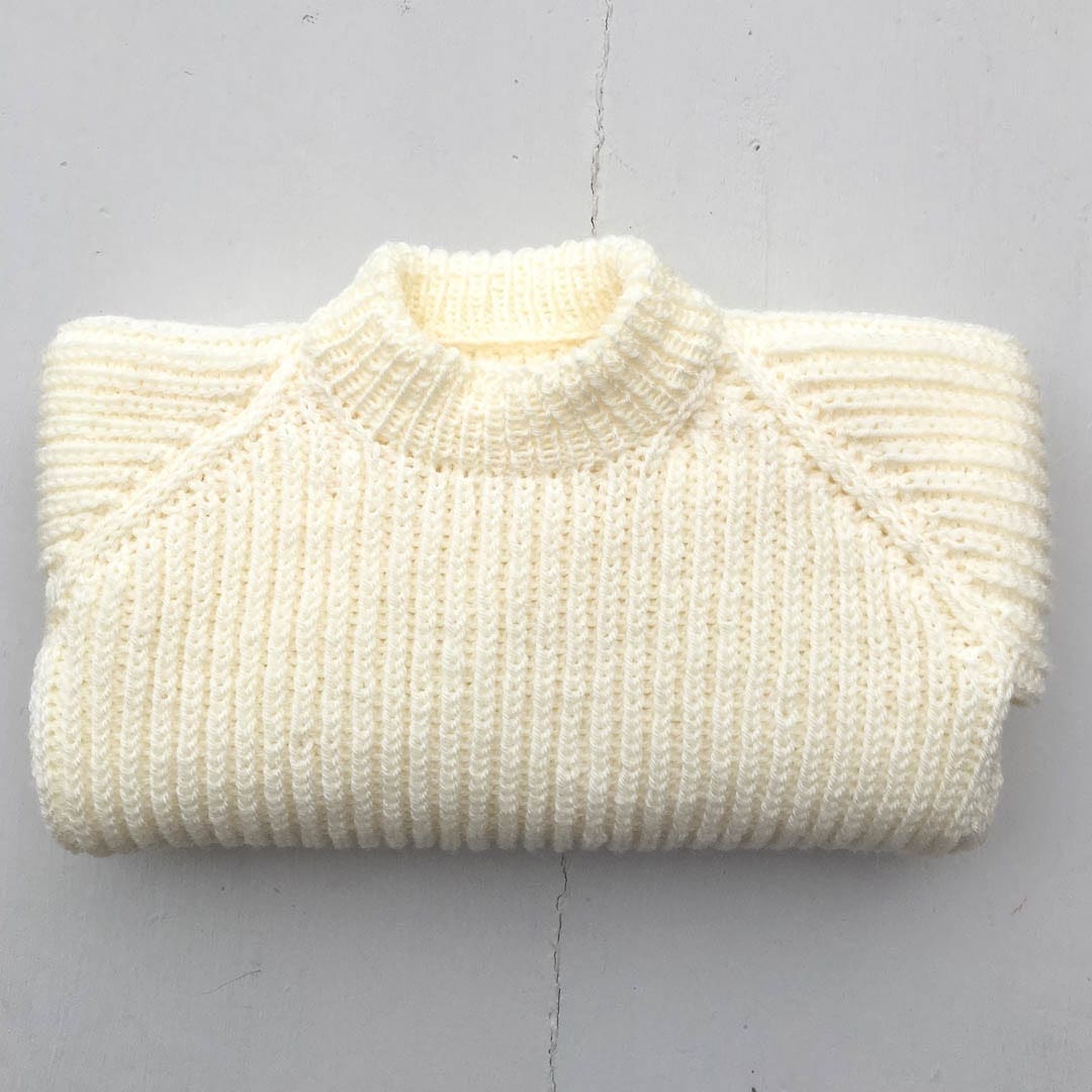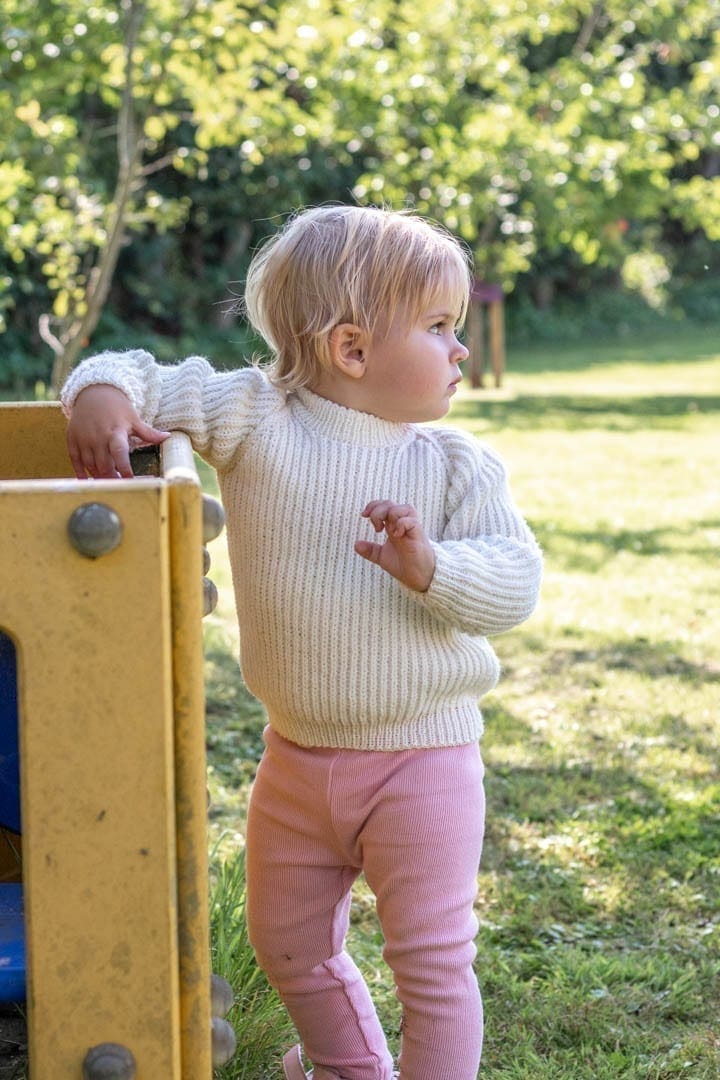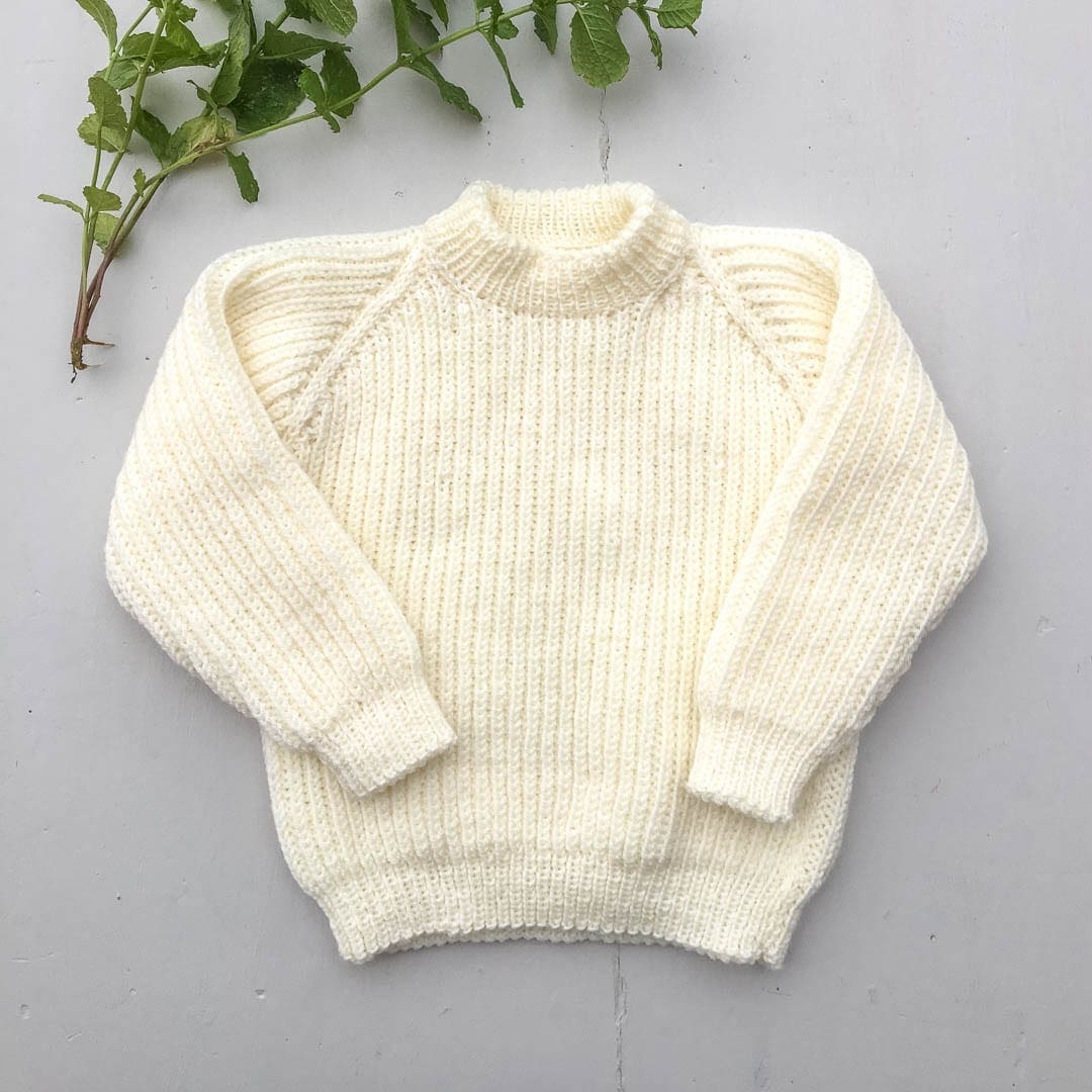 Opskriften går fra 2 – 16 år og er strikket i Bøllefrø merinould i farve 05 Råhvid.