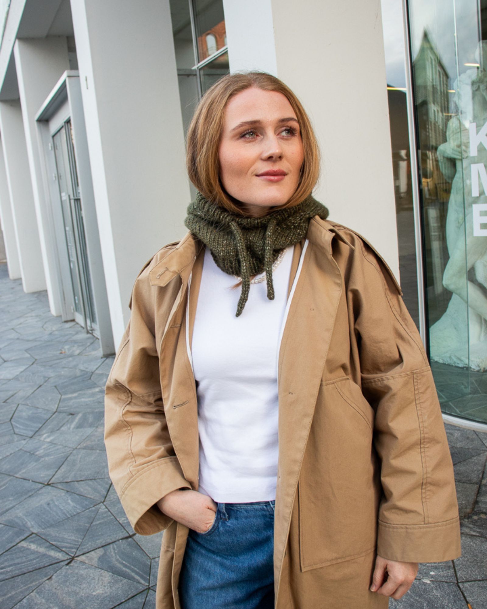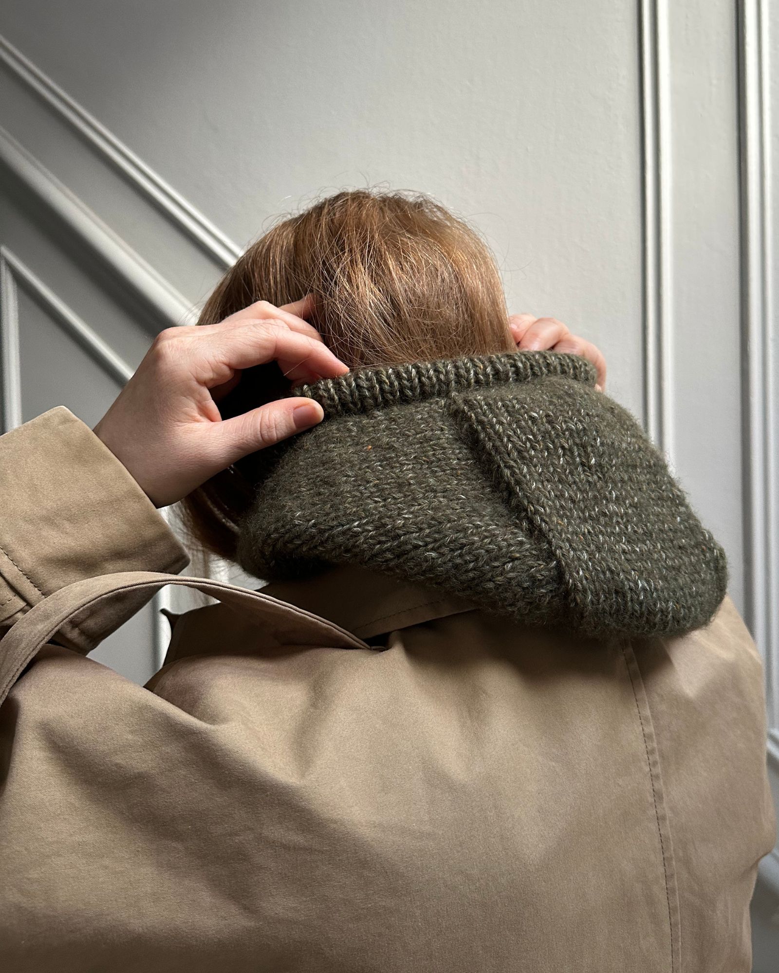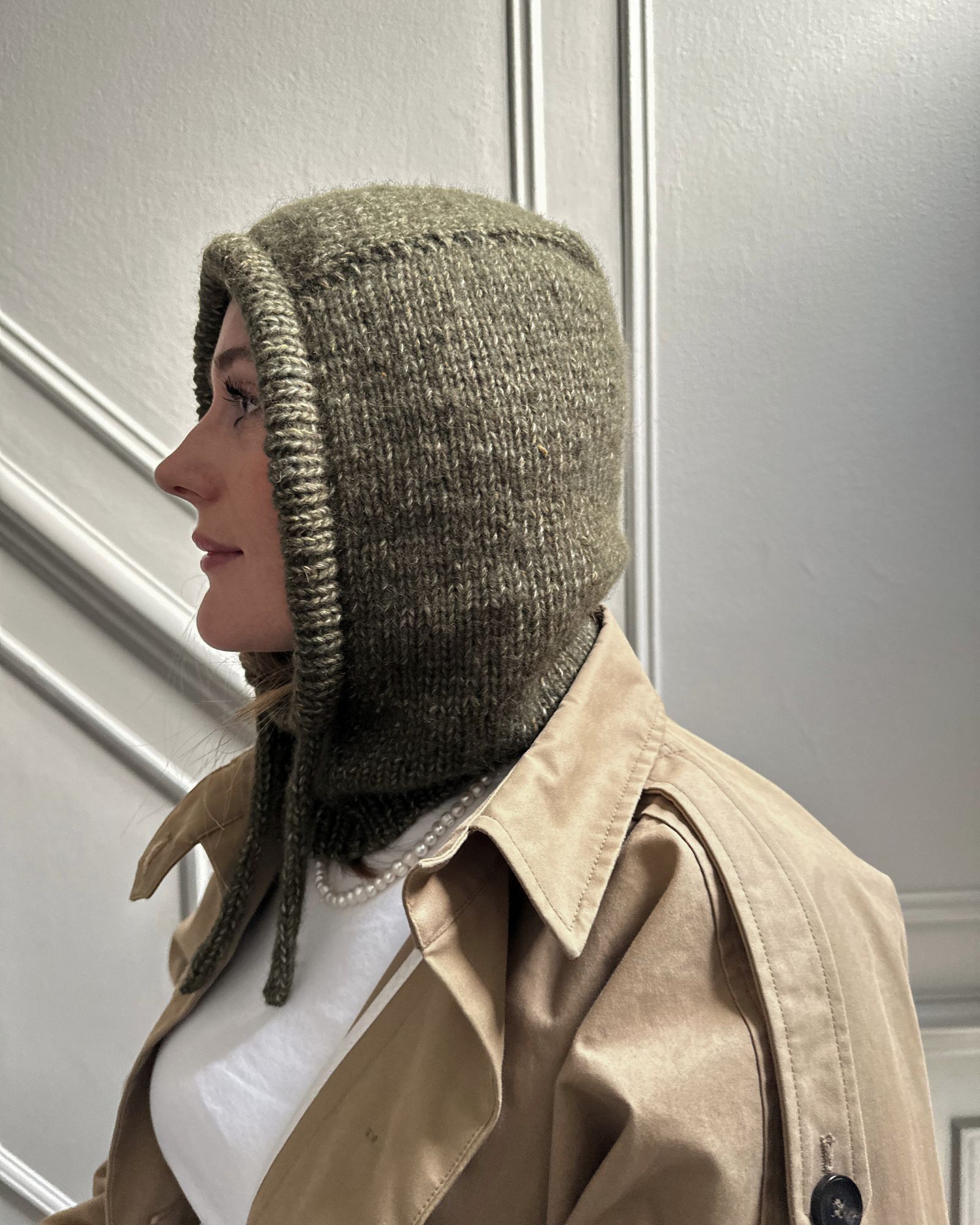 Den grønne Bea Balaclava er strikket i Tante Grøn Moon – 153 Hunter og Tante Grøn Tweed farve 1153 Olive.