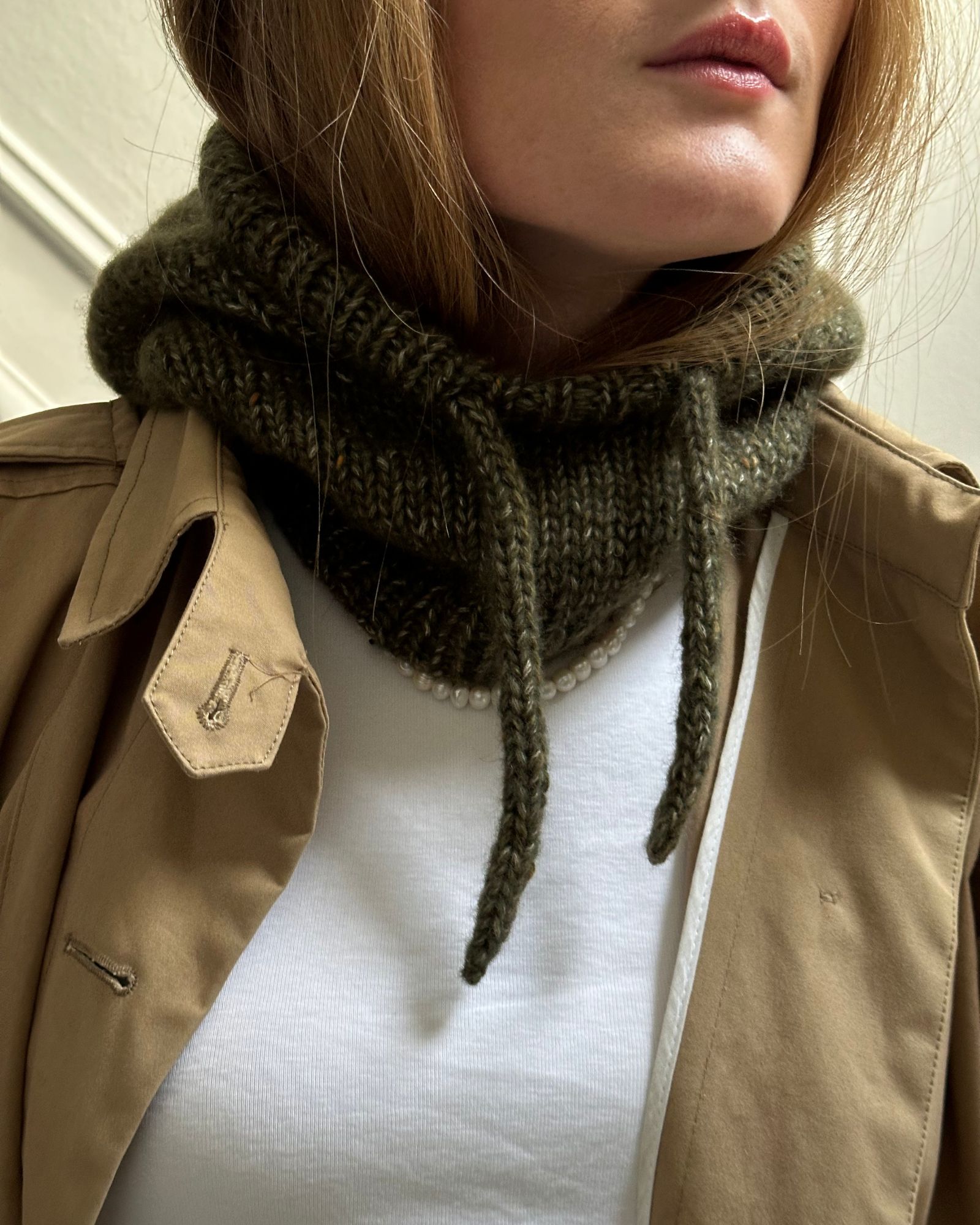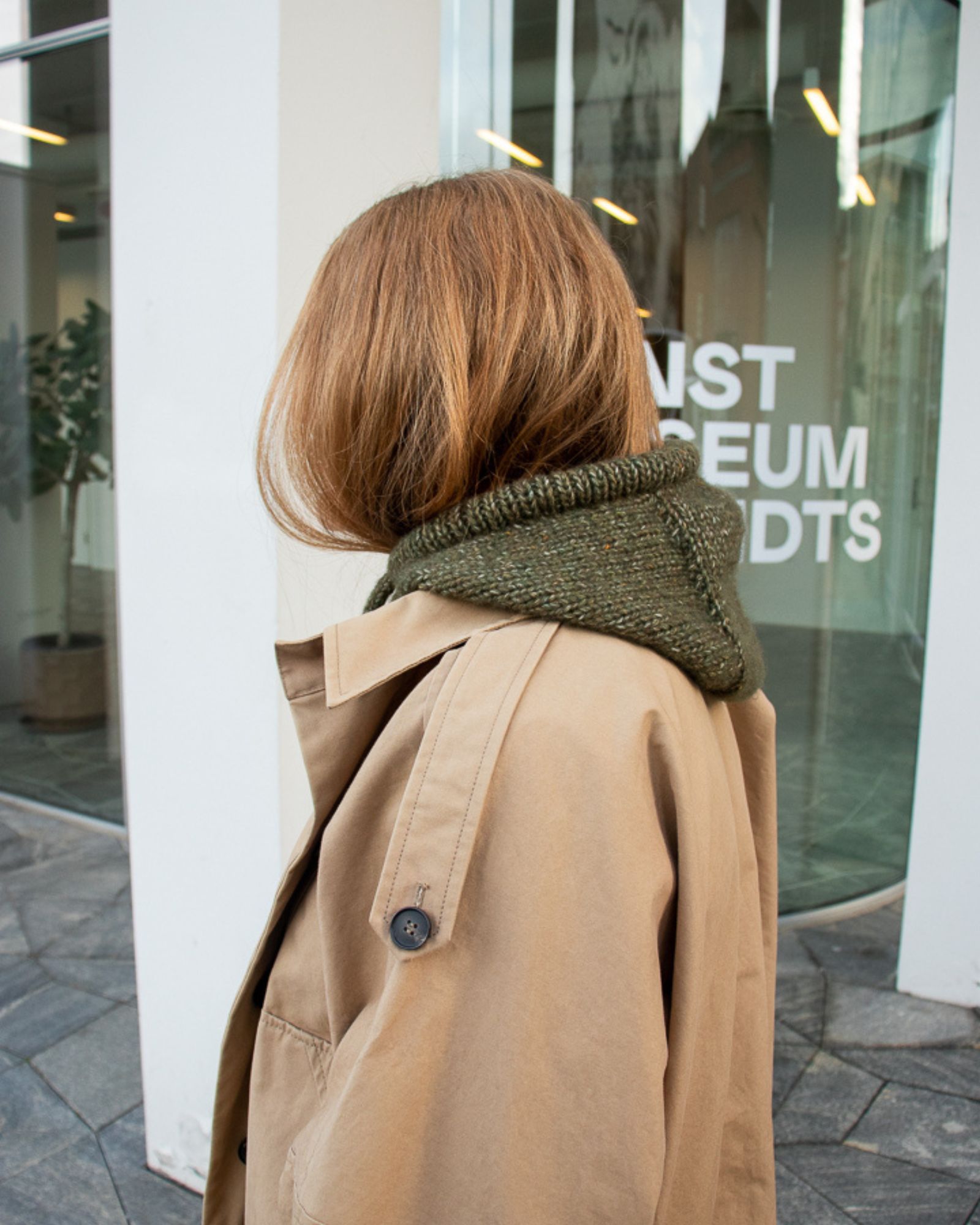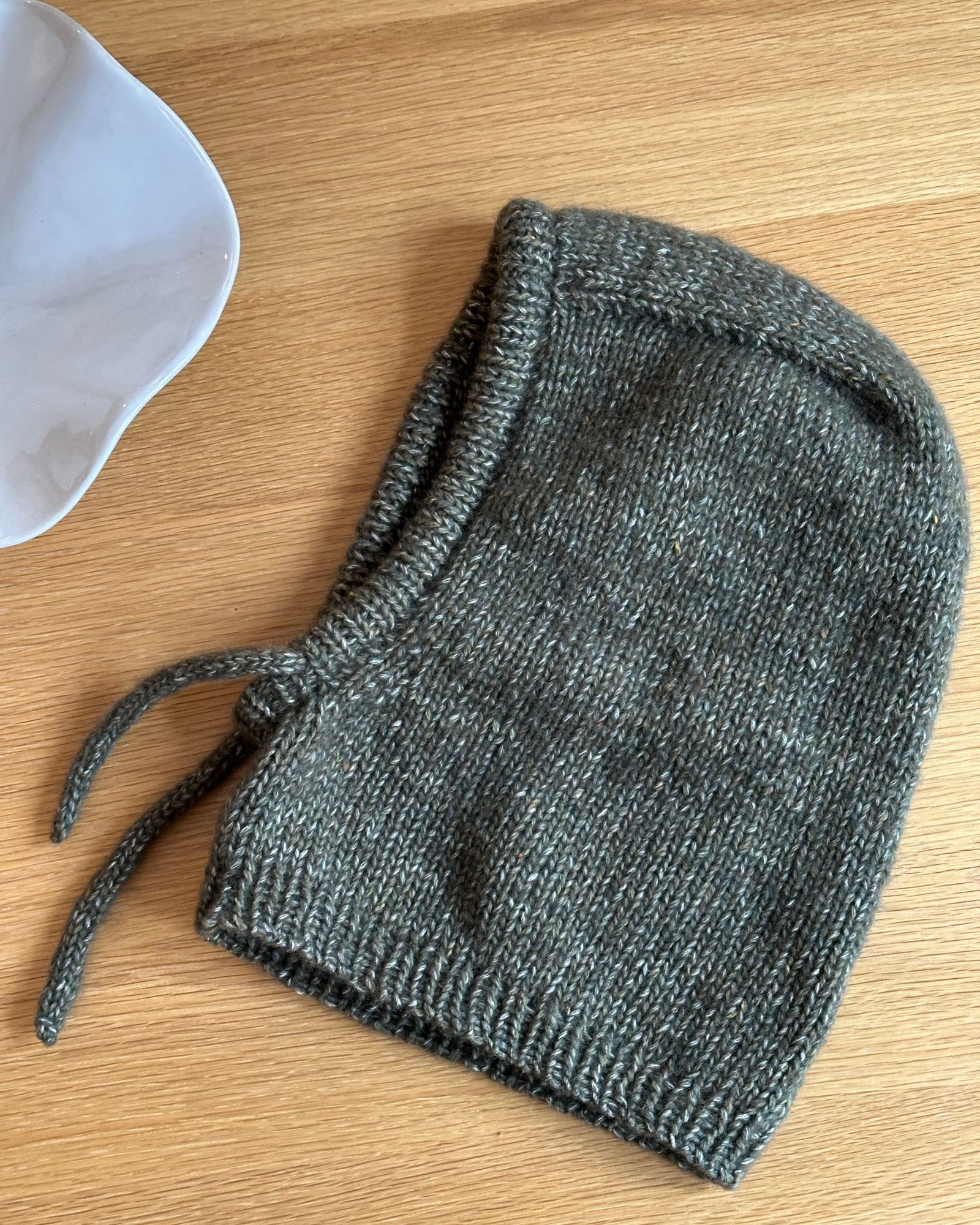 Den grønne Bea Balaclava er strikket i Tante Grøn Moon – 153 Hunter og Tante Grøn Tweed farve 1153 Olive.