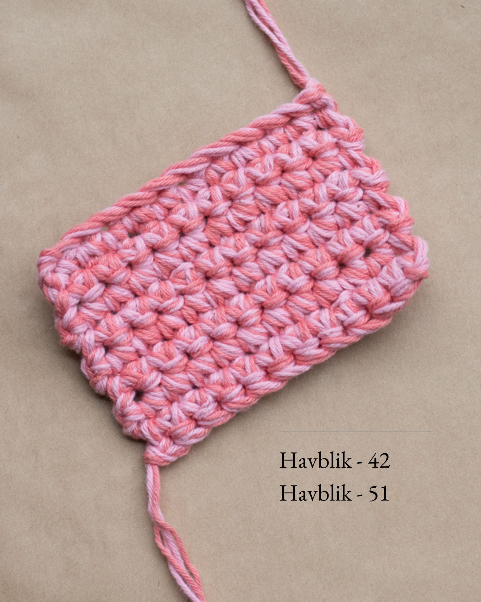 Den blå og rosa Boxy Bag er hæklet i Havblik. 2 tråde af farven 93 Kobolt Blå og 2 tråde 23 Rosa.