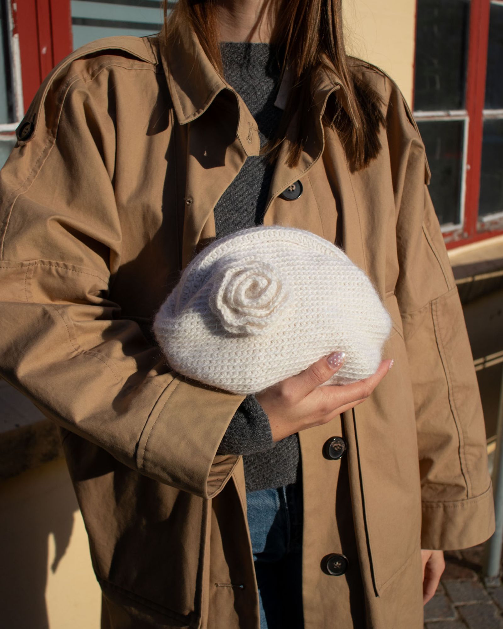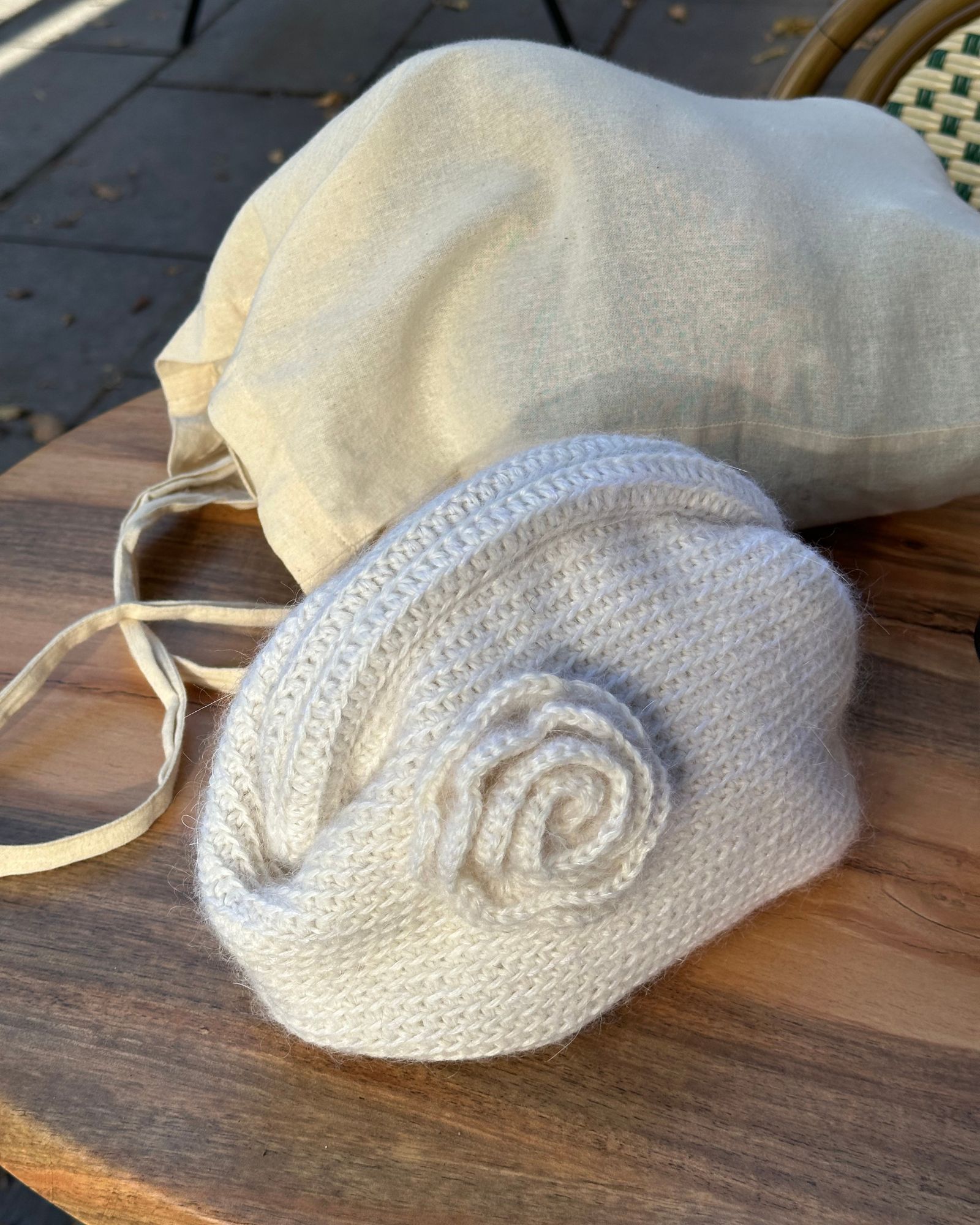 Farver på billederne: Den råhvide Camellia Clutch er hæklet i Valmue farve 501 Fløde og Soft Silk Mohair farve 102 White Dove.