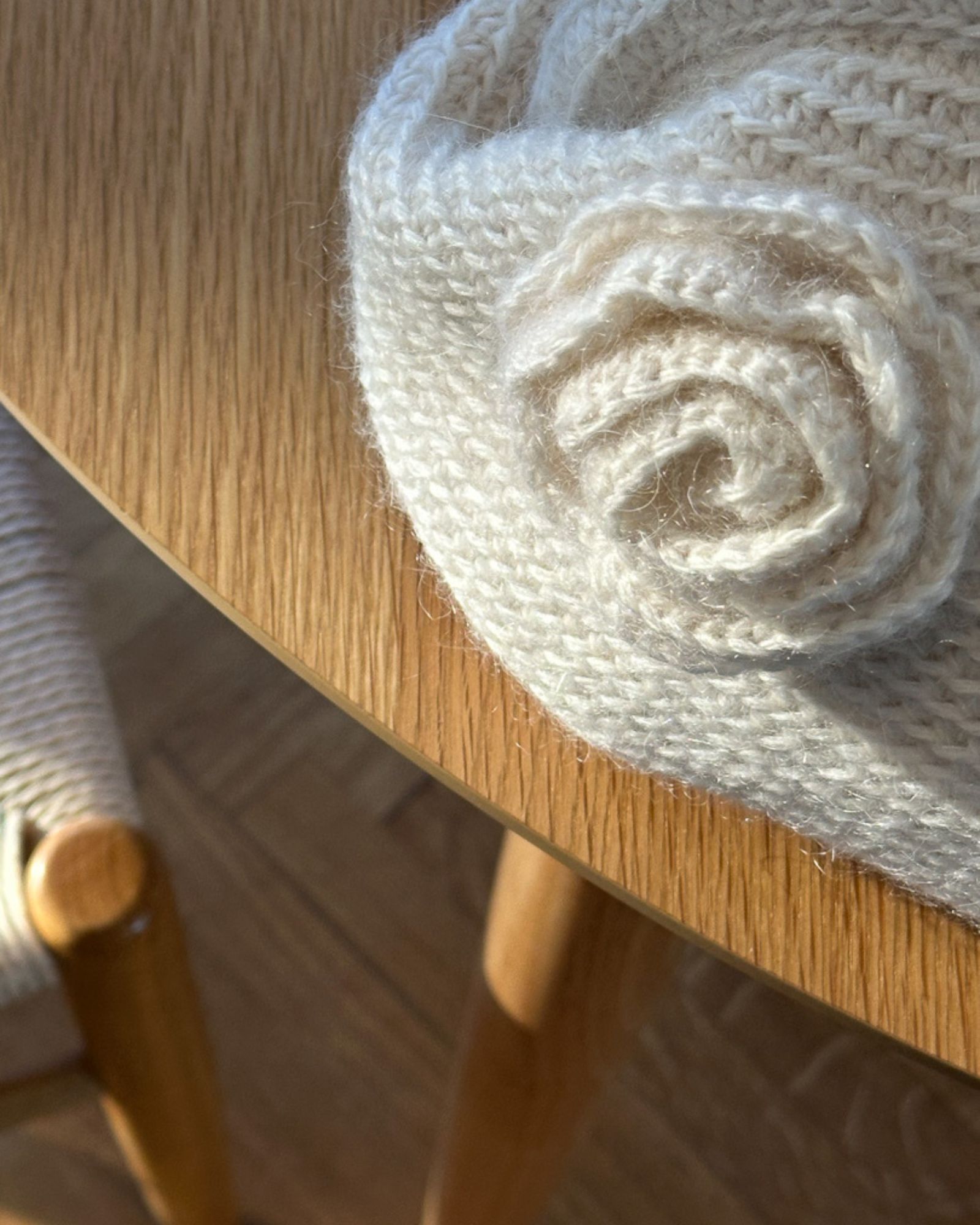 100 g Valmue fra Tante Grøn (50 g = 130 m) hæklet sammen med 50 g Soft Silk Mohair fra Tante Grøn (25 g = 210 m).