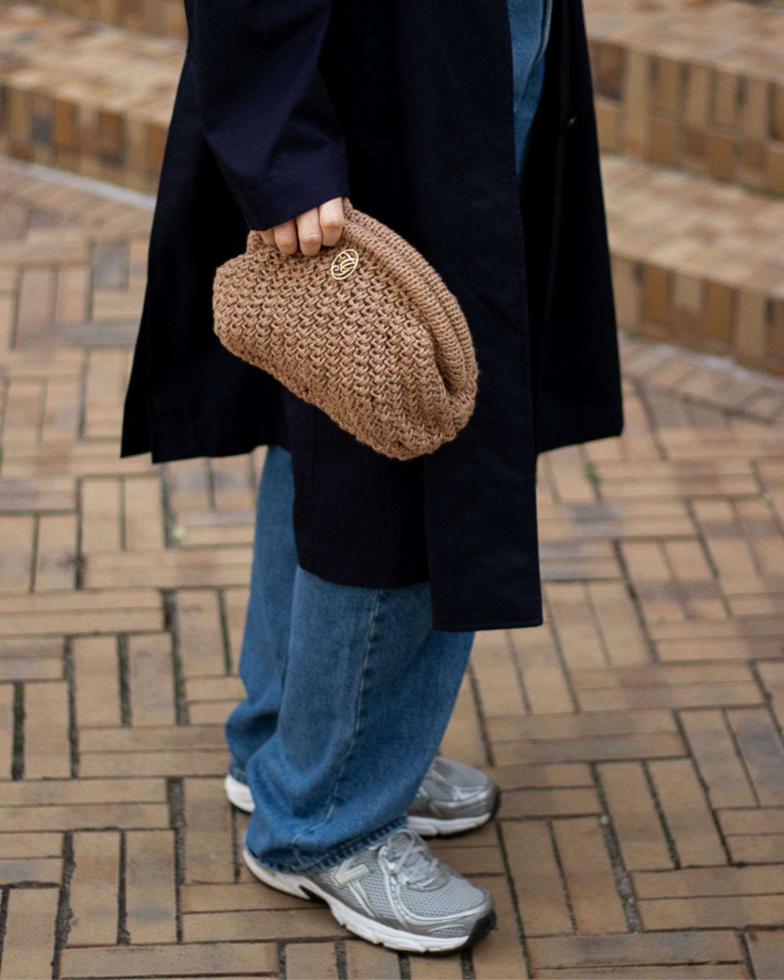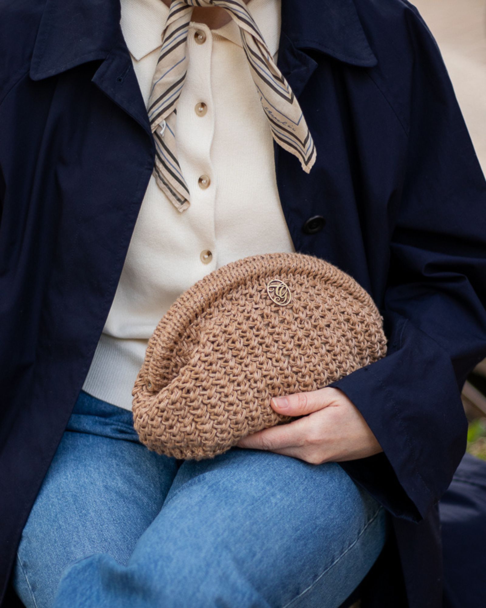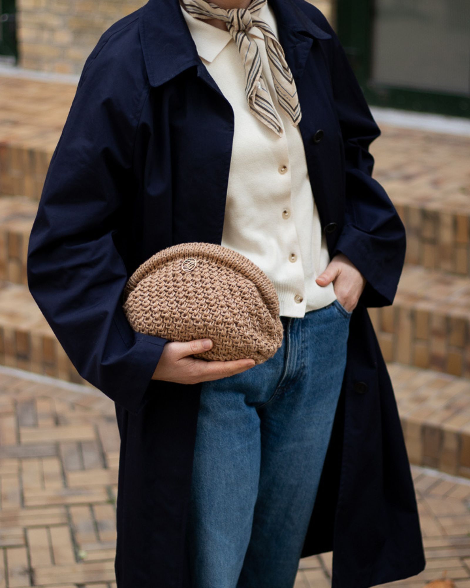 Farver på billederne: Den camelfarvede Celina Clutch er strikket i Linen farve 07 Brown Sugar sammen med Havblik farve 16 Lys Brun.