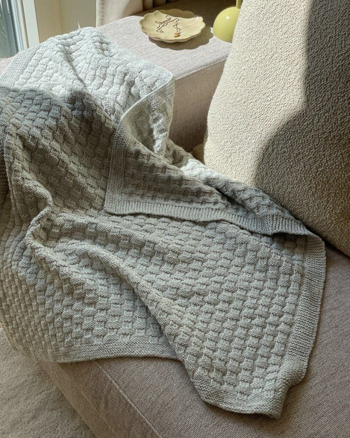 Farver på billederne: Chess Baby Blanket er strikket i Bøllefrø farve 32 Perlegrå.