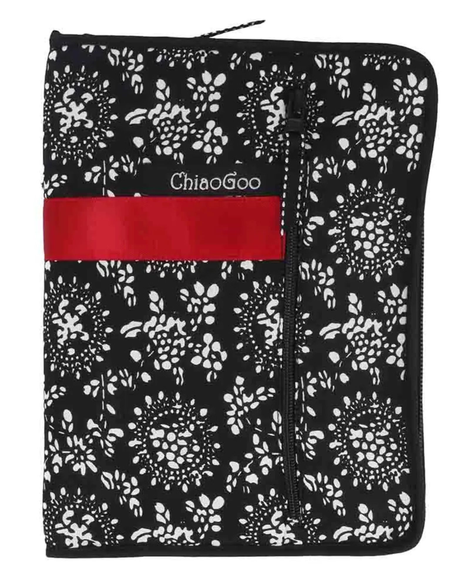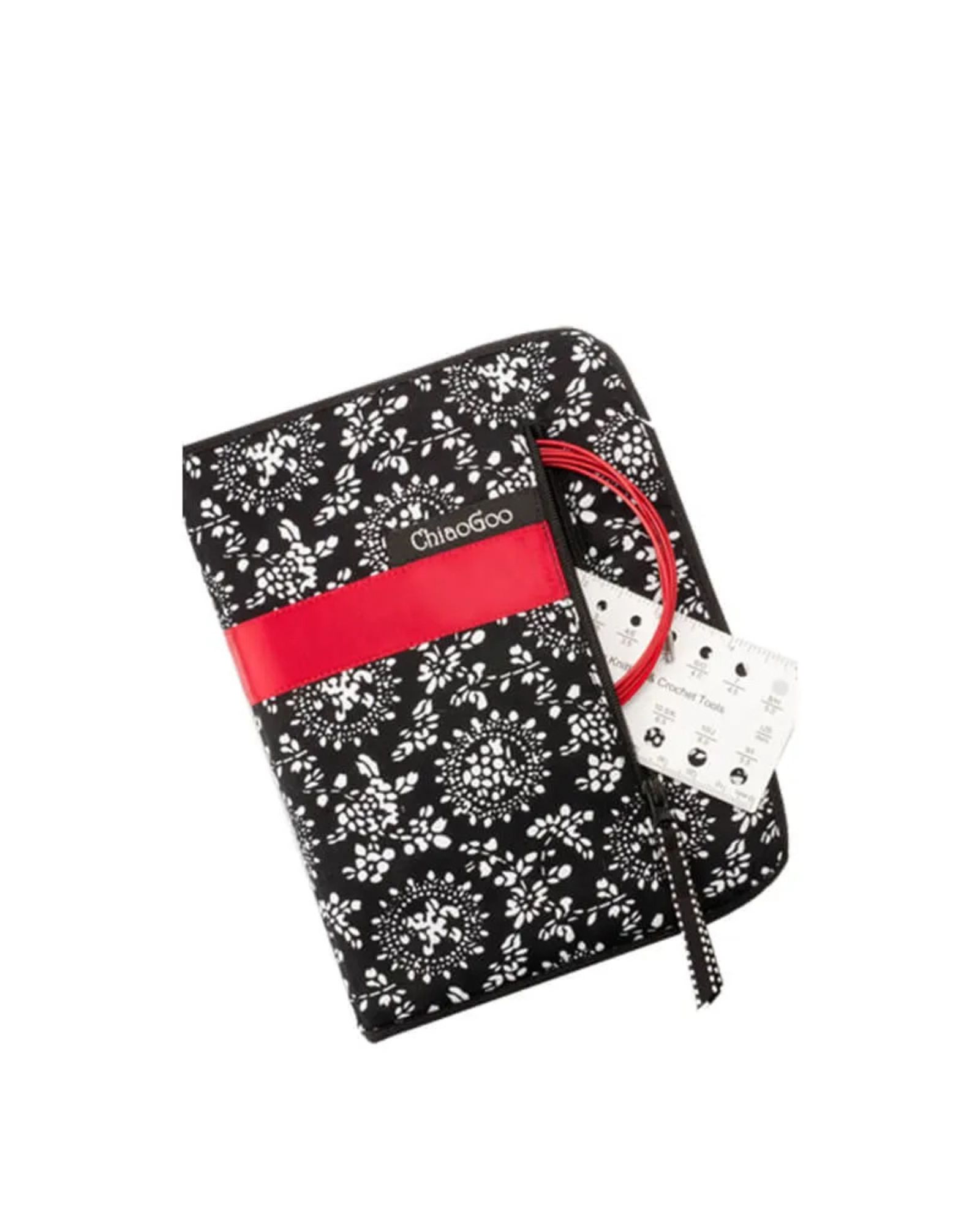 TWIST Lace Small sættet leveres i et kompakt etui med mærkede lommer til pindespidserne i størrelser fra 2.75 til 5.00 mm. I de udvendige lommer med lynlås er der god plads til kabler og tilbehør. Etuiet er syet i sort og hvidt blomsterstof med røde detaljer og lukkes med lynlås på tre sider.