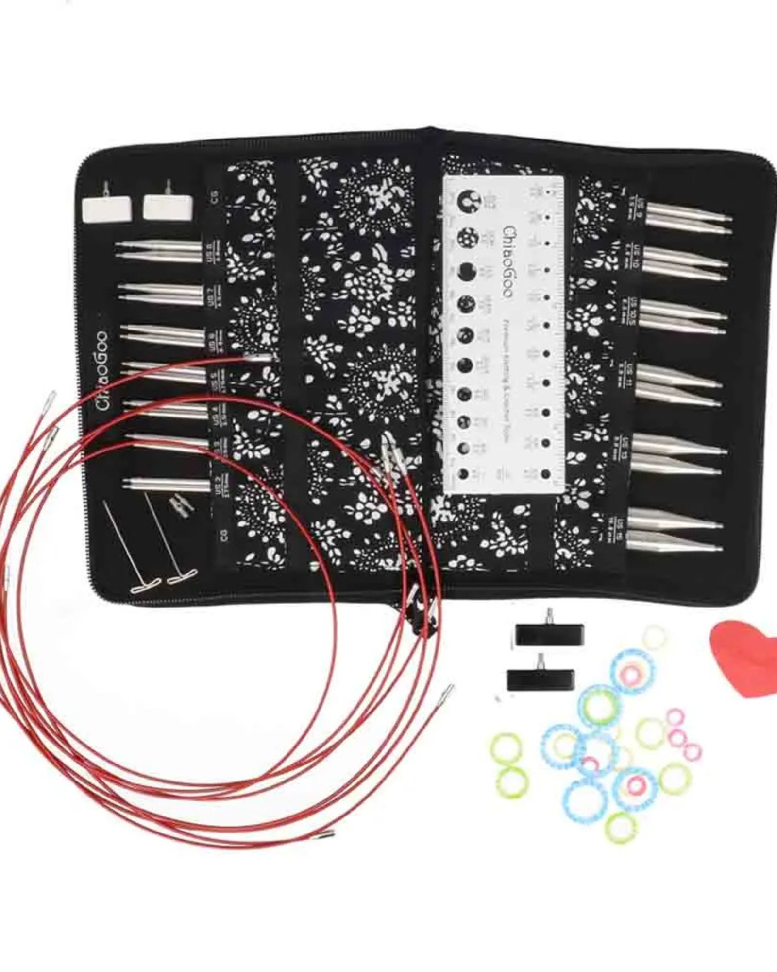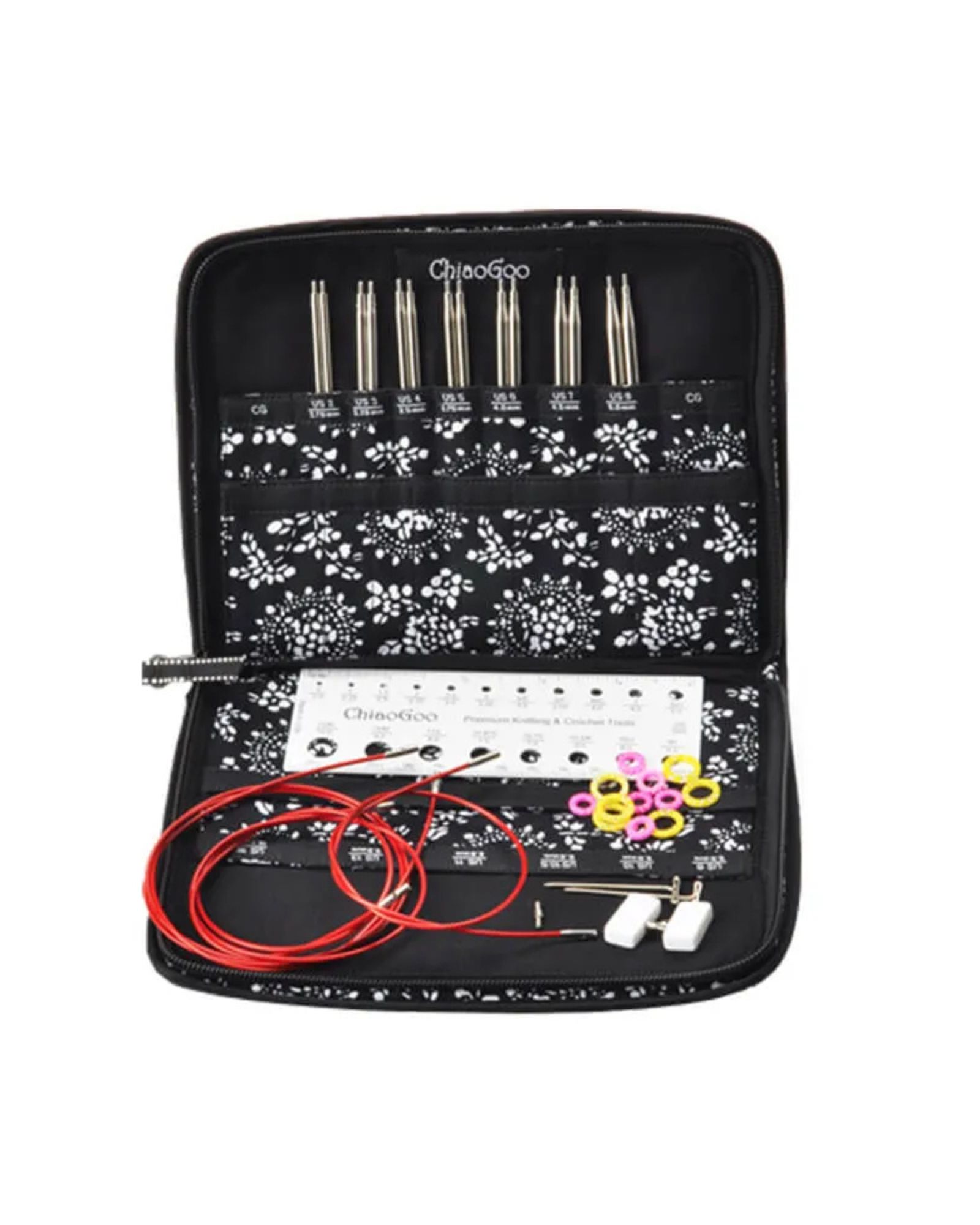 Med TWIST Lace Small udskifteligt rundpindesæt fra ChiaoGoo får du alt hvad du behøver for at samle den perfekte rundpind til dit strikkeprojekt. Sættet indeholder pindespidser i syv størrelser, fleksible kabler og praktisk tilbehør. De rustfrie stålspidser er ekstra spidse, hvilket gør dem ideelle til mønstre som hulmønstre, strukturstrik, bobler og snoninger. De røde nylonbelagte kabler består af flere ståltråde, som gør dem meget fleksible og forhindrer at de slår knæk eller tvister. Pindespidserne skrues let på kablerne og kan efterspændes med den medfølgende nøgle.