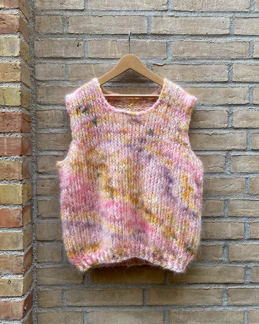 Colour Pop Vest er en enkel vest, hvor garnet for lov til at give vesten et helt unikt farvespil. Vesten strikkes i “Den Behårede” fra Handdyed, som er en smørblød og fluffy håndfarvet mohair. Vesten strikkes nede fra og op på rundpind. Herefter deles ryg og forstykke, hvor disse strikkes op hver for sig. Slutteligt hækles en kant rundt ved halskanten og ærmegabet, men du kan også med fordel strikke en ribkant på. Her anbefaler vi blot at tilkøbe et ekstra nøgle. Da garnet er håndfarvet kan hvert fed variere i farve. Sørg derfor for at bestille nok til dit projekt, da indfarvningerne ikke er identiske. Til større projekter kan vi anbefale at have et gradvist farveskift. Når det ene nøgle er ved at slippe op, kan du fx strikke to pinde med det ene nøgle og to pinde med det andet, indtil der er kommet en fin farveovergang mellem de to håndfarvet nøgler. Vær opmærksom på at strikkefastheden overholdes, så garnforbruget passer. Lav en strikkeprøve inden du går i gang for at måle strikkefastheden.