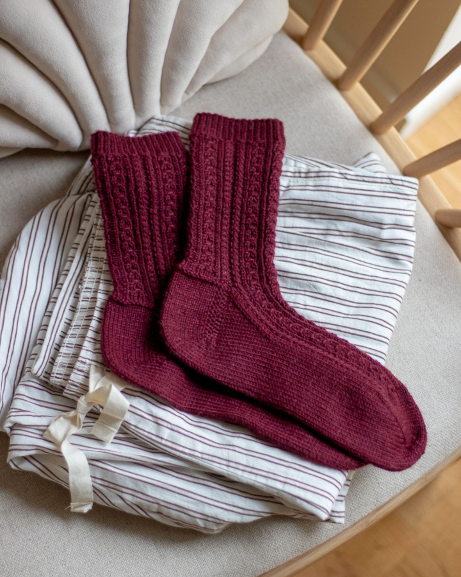 Farve på billederne: De røde Dagmar Socks er strikket i Birk, farve 21 Bordeaux og de hvide Dagmar Socks er strikket i Birk, farve 05 Milk.