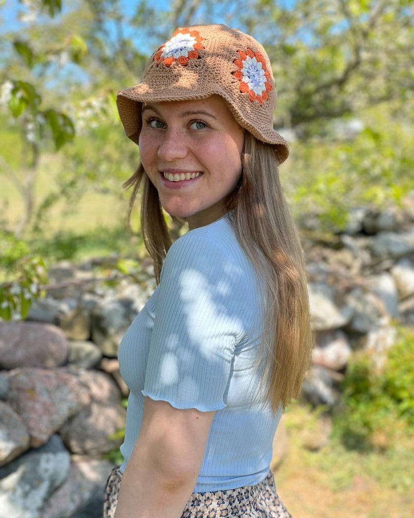 Martha har designet en sød, smuk og meget elegant bøllehat, som kan bruges henover sommeren. Den er designet med samme smukke oldemorsfirkanter med blomstermotiv, som I allerede kender fra tidligere til Daisy Bag. Konstruktionen er enkel, så selv nyopstartede hæklere har mulighed for at være med! Farvekombinationerne er mange, og det er derfor muligt at skabe sin helt egen unikke bøllehat i vores Havblik garn.