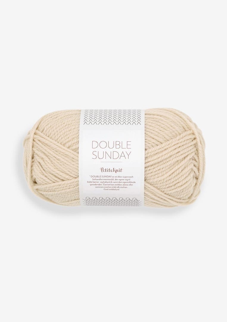 Double Sunday er en tykkere version af den velkendte Sunday merinould. Double Sunday er til pinde 3,5-4 og er en skøn blød 100 % merinould. Du kan bruge Double Sunday til børnestrik, voksenstrik og så er den særdeles fin stikket sammen med Silk Mohair.