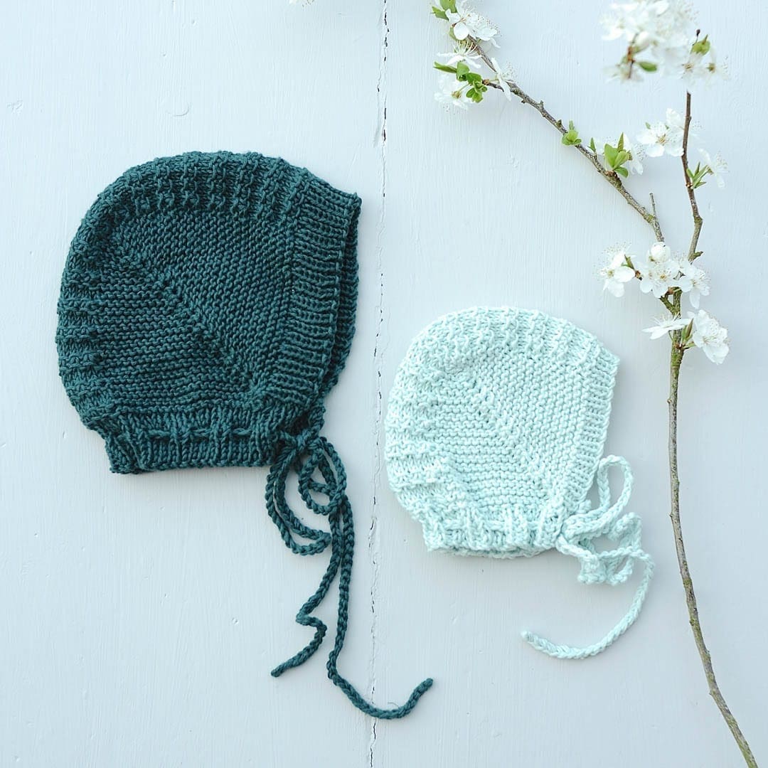 De er strikket i Tante Grøns “Bio Blomsterfrø¸” på pinde nr. 3 og der bruges ca. 1 nøgle til begge størrelser til hver størrelse.