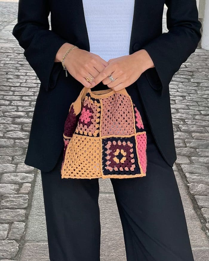 Det er en fin, detaljeret taske, som kan styles til både hverdag og fest! Tasken hækles således, at du kan designe hver firkant, lige præcis som du ønsker. Derfor er det muligt at skabe et helt unik produkt, hvor de rette farvekombinationer matcher lige dig. Tasken er nem at hækle, den består af oldemorsfirkanter, som til sidst hækles sammen. Slutteligt hækles en kant på med hank og coveret til bunden hækles.