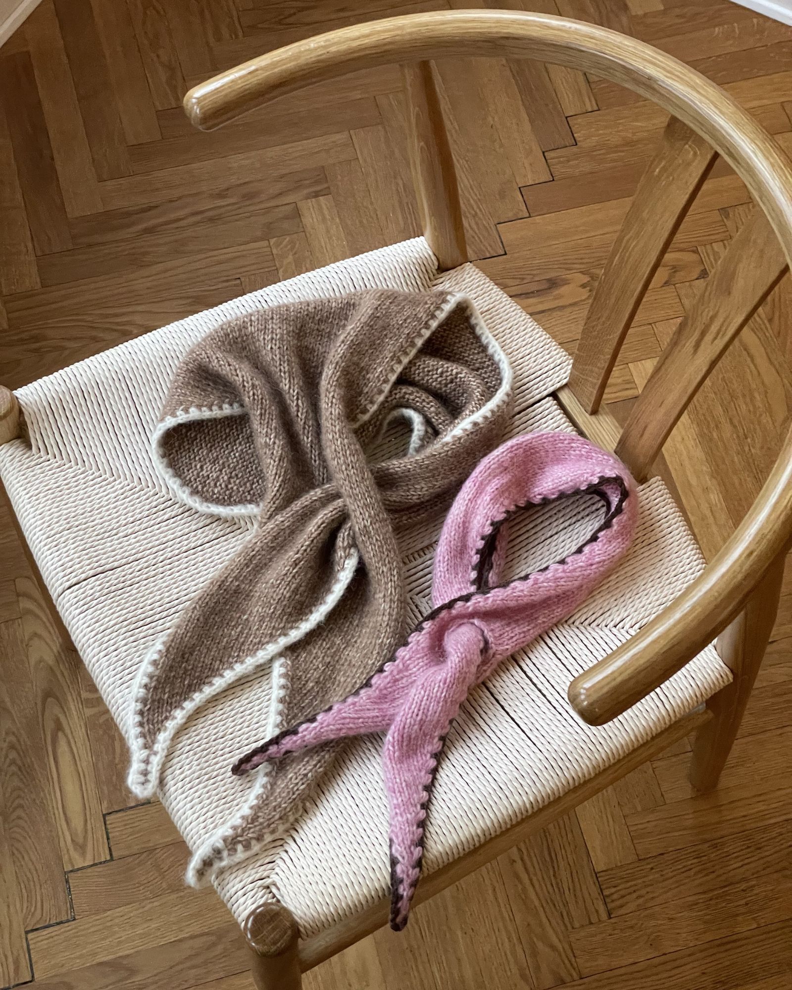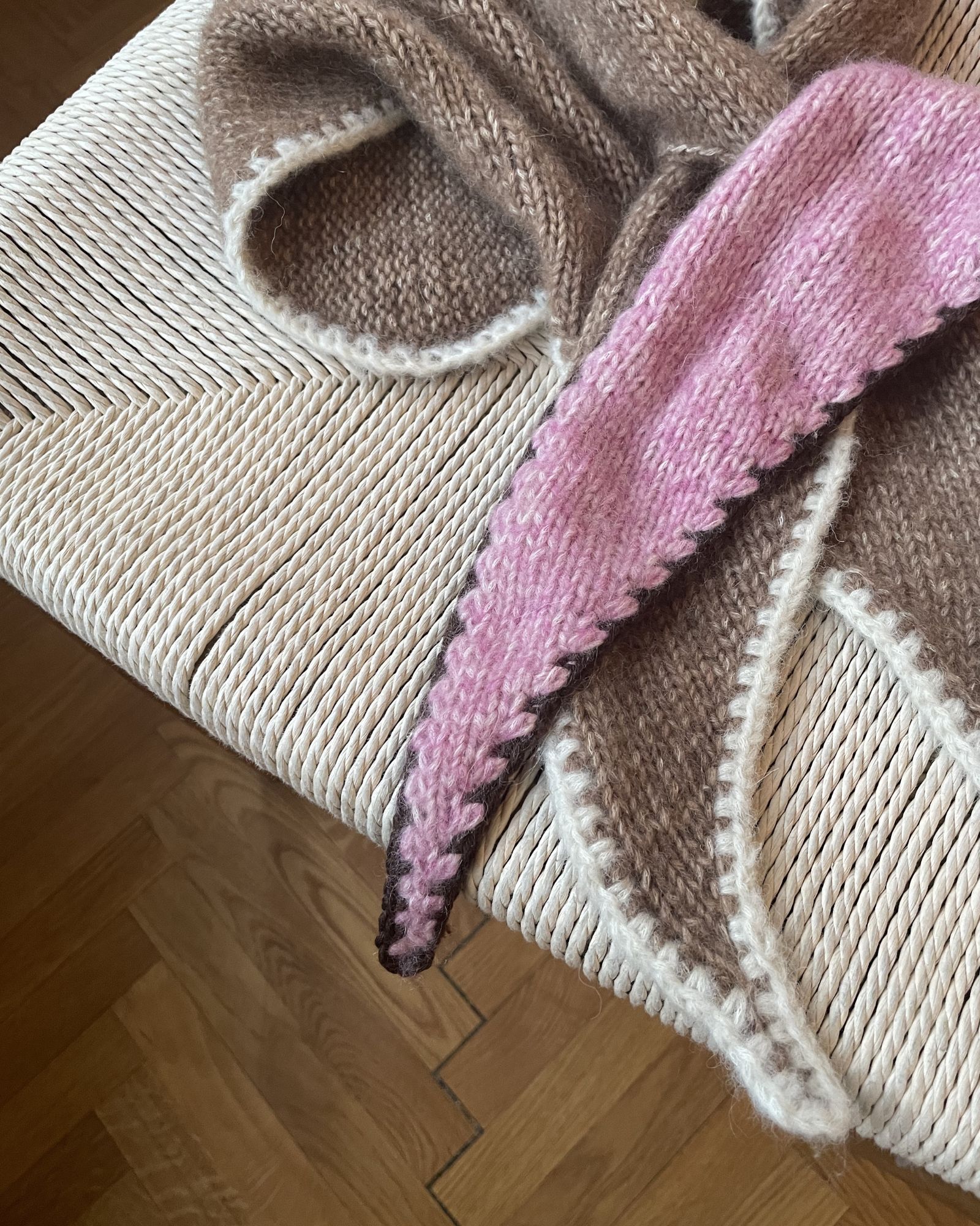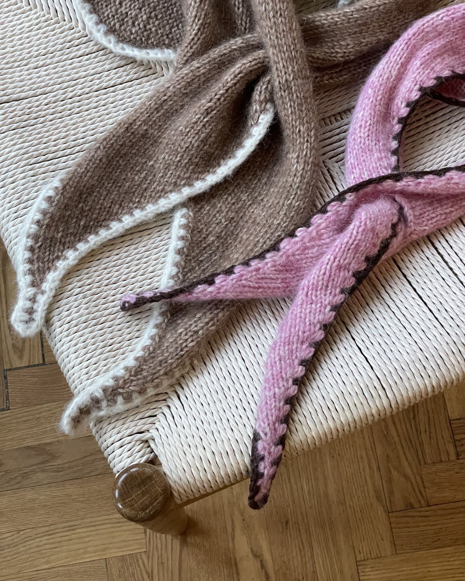 Det lyserøde Filippa Scarf er strikket i størrelse 1 i Moon i fv. 114 Rose Bath med Bøllefrø i fv. 21 Brun til kontrastkanten.