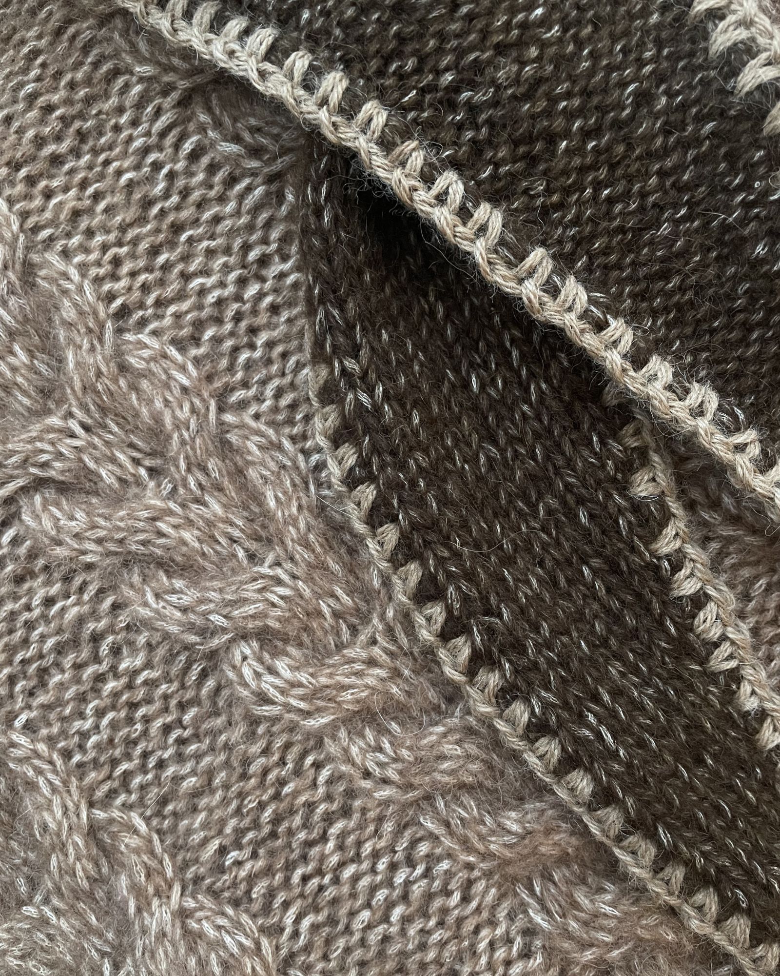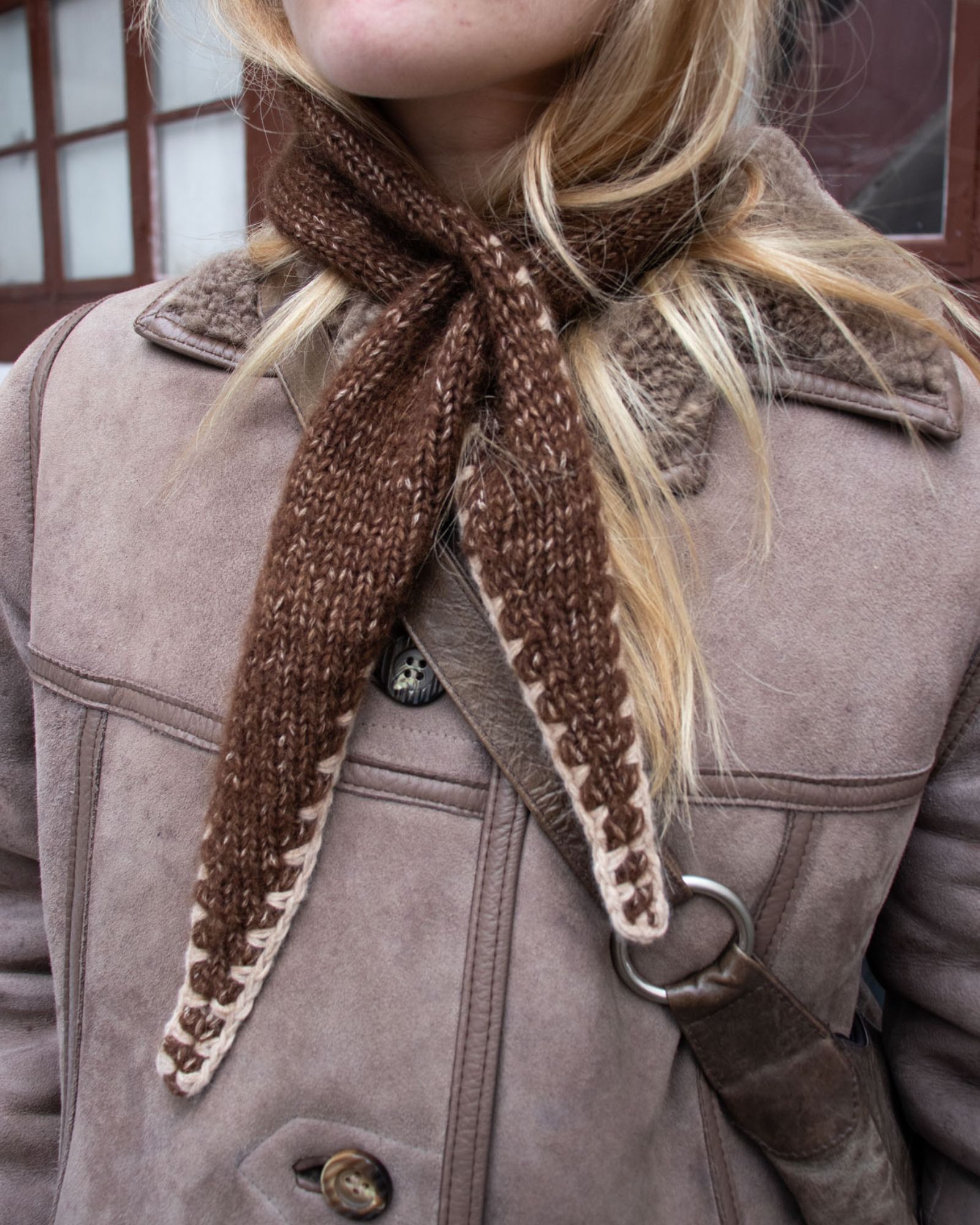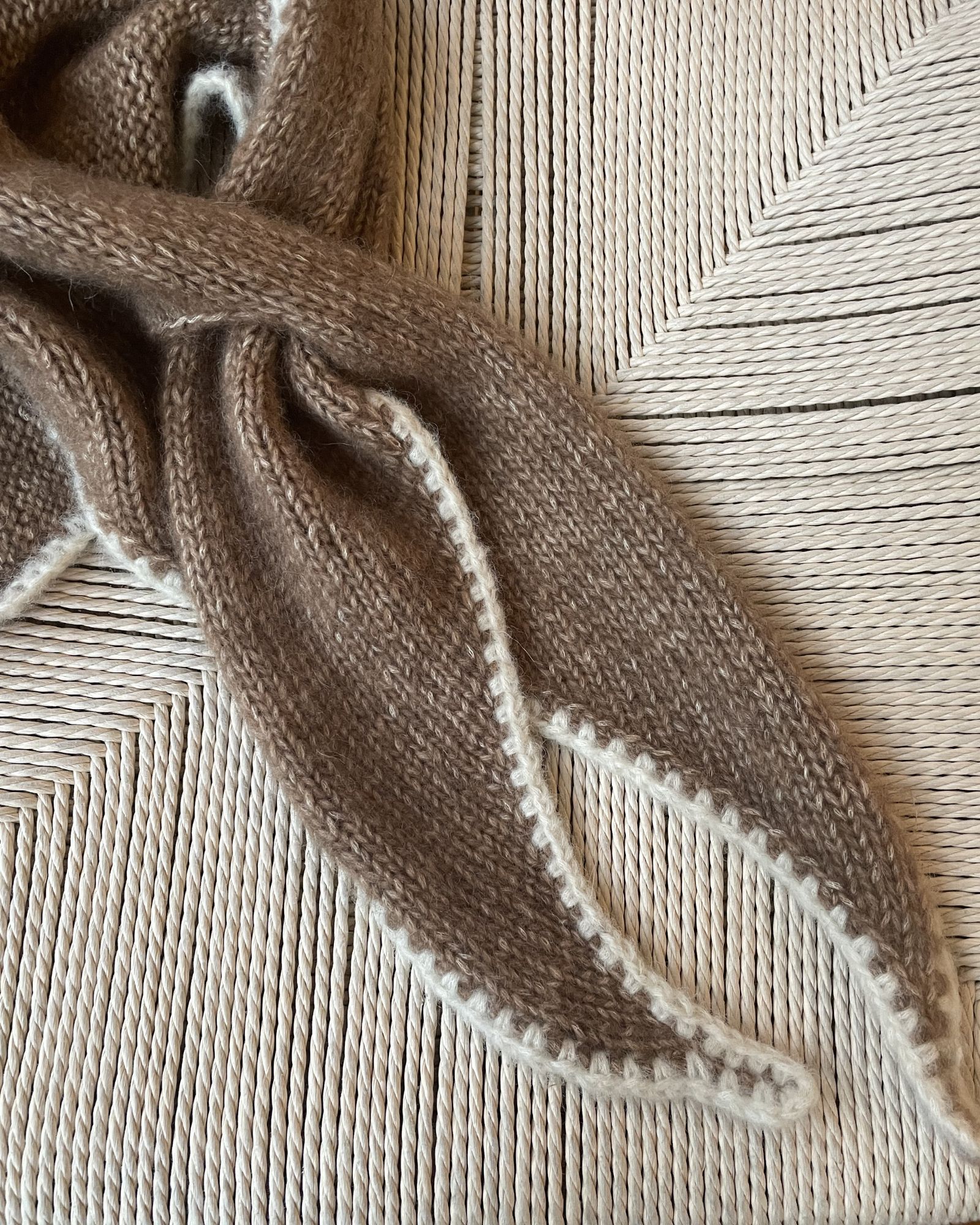 Det lysebrune Filippa Scarf er strikket i størrelse 1 i Moon i fv. 103 Nougat med Birk i fv. 05 Milk til kontrastkanten.