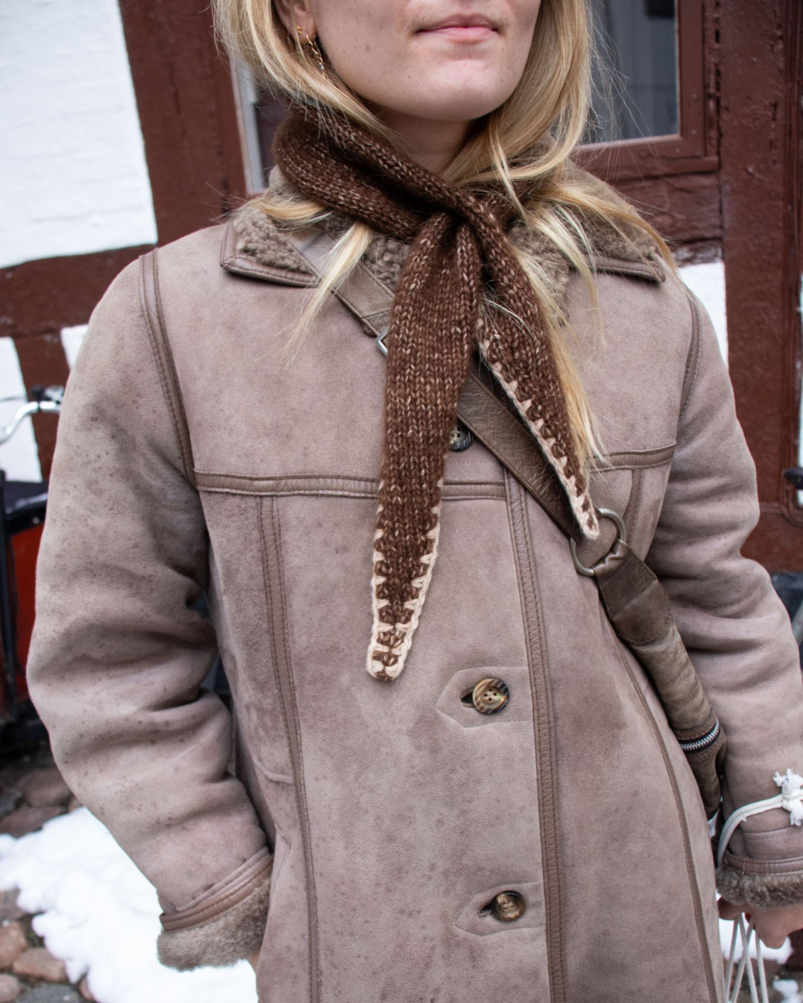 Det mørkebrune Filippa Scarf er strikket i størrelse 1 i Moon i fv. 125 Cacao med Valmue i fv. 517 Lys Camel til kontrastkanten.