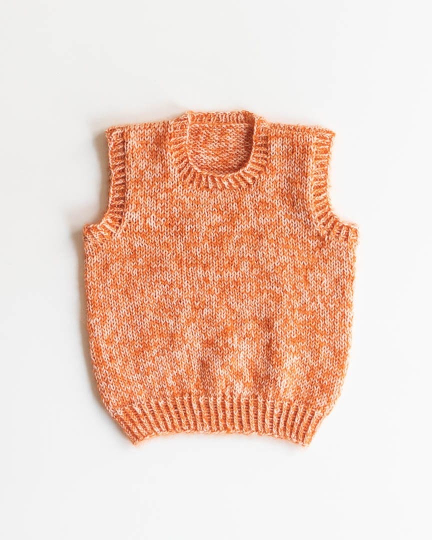 Vesten er med fine ribkanter og helt enkel i udtrykket. Den er strikket i en tråd Bøllefrø Merinould og én tråd Silk Mohair. Det gør at vesten luner dejligt men samtidig er let og blød. Vesten er sød over en langærmet bluse eller ud over en kjole med sit helt enkle udtryk. Opskriften indeholder også en variant med vragen ud. Det giver et fedt udtryk.