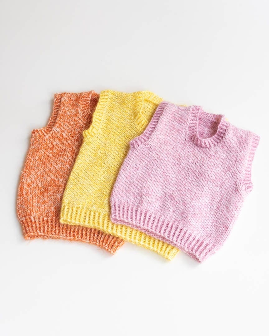 Vesten er med fine ribkanter og helt enkel i udtrykket. Den er strikket i en tråd Bøllefrø Merinould og én tråd Silk Mohair. Det gør at vesten luner dejligt men samtidig er let og blød. Vesten er sød over en langærmet bluse eller ud over en kjole med sit helt enkle udtryk. Opskriften indeholder også en variant med vragen ud. Det giver et fedt anderledes udtryk.