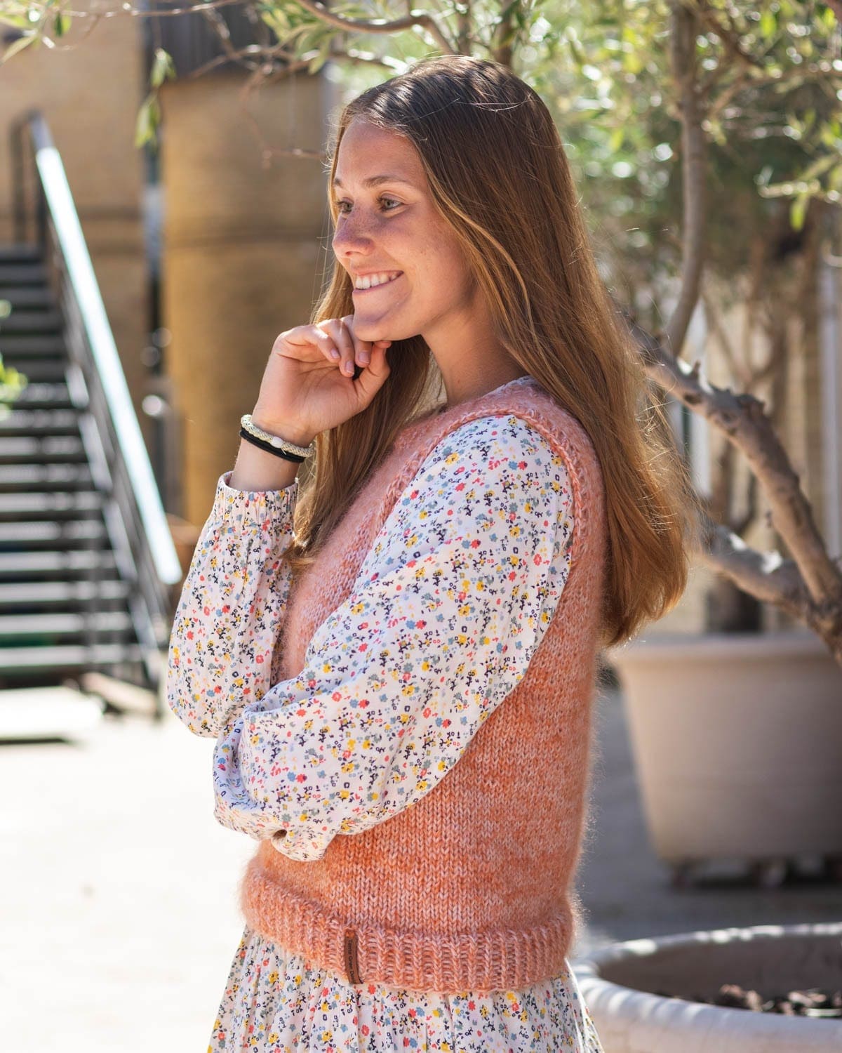 The vest is knitted from the bottom up with rib edges It is knitted with three threads: two threads Soft Silk mohair and one thread Bøllefrø.