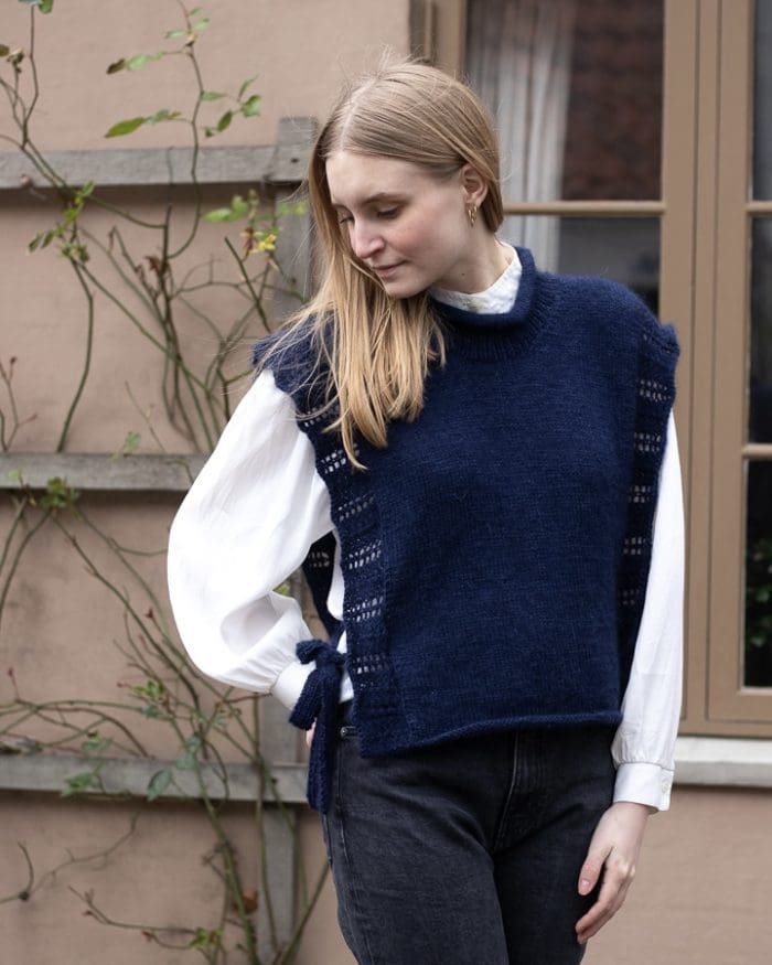Garden Vest is a simple and elegant vest with fine lace edges that add a feminine look. The vest is knitted in a delicate combination of Merino wool and Silk Mohair.