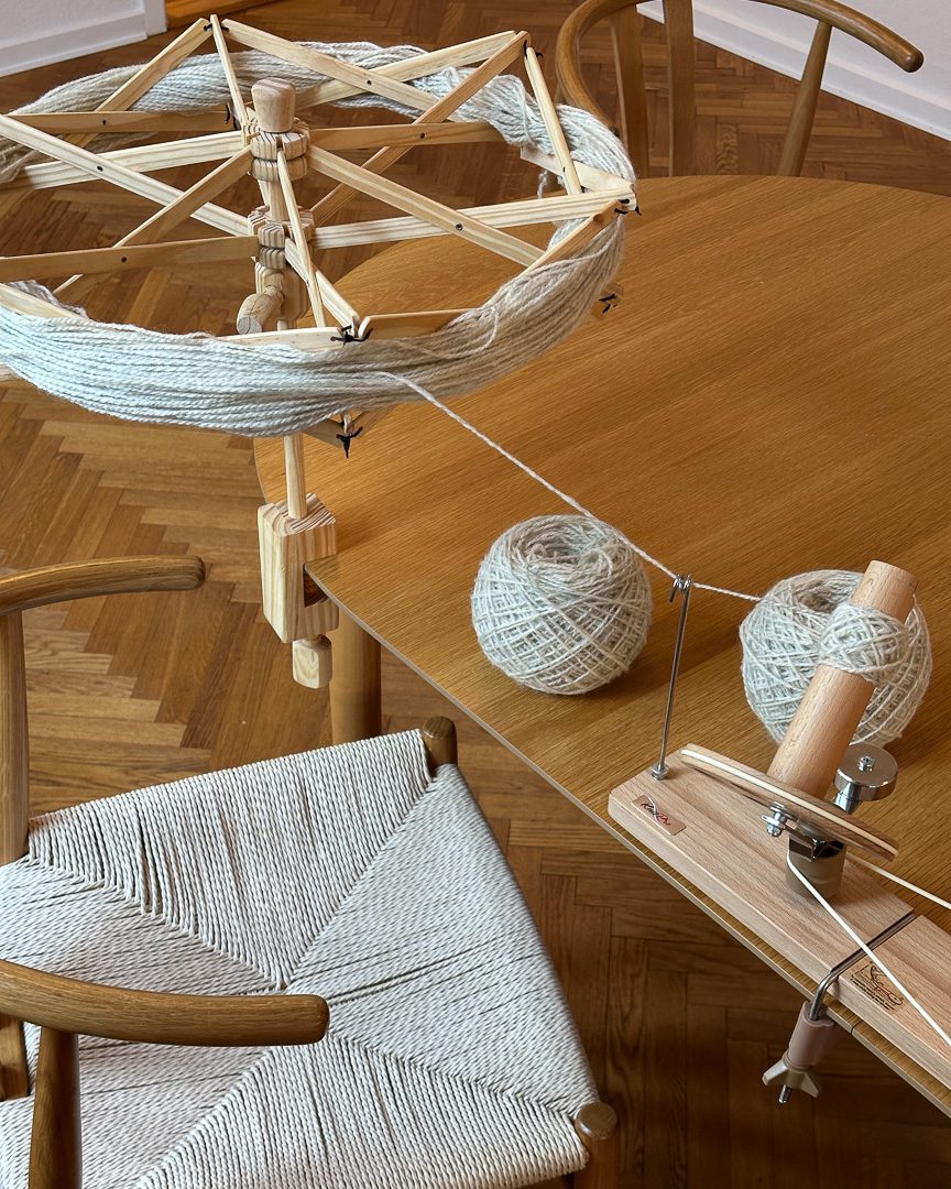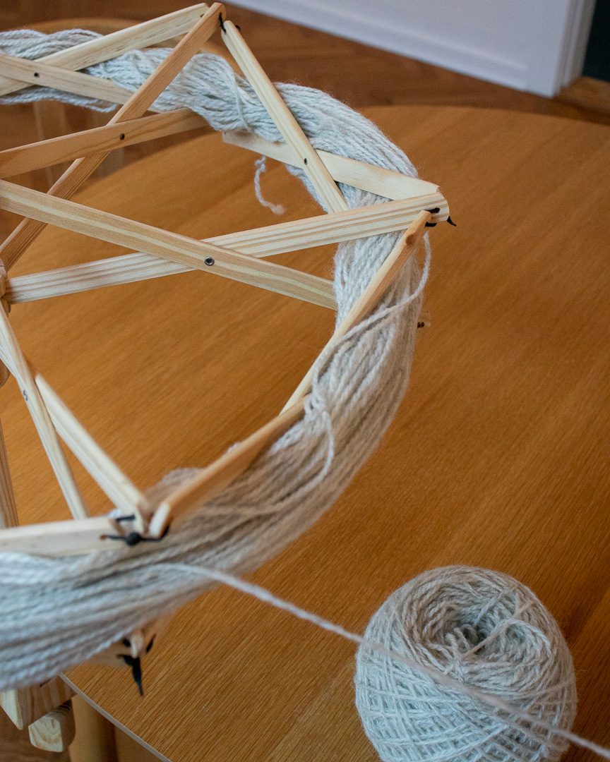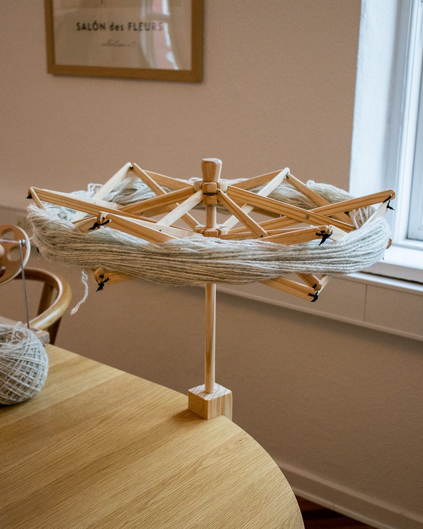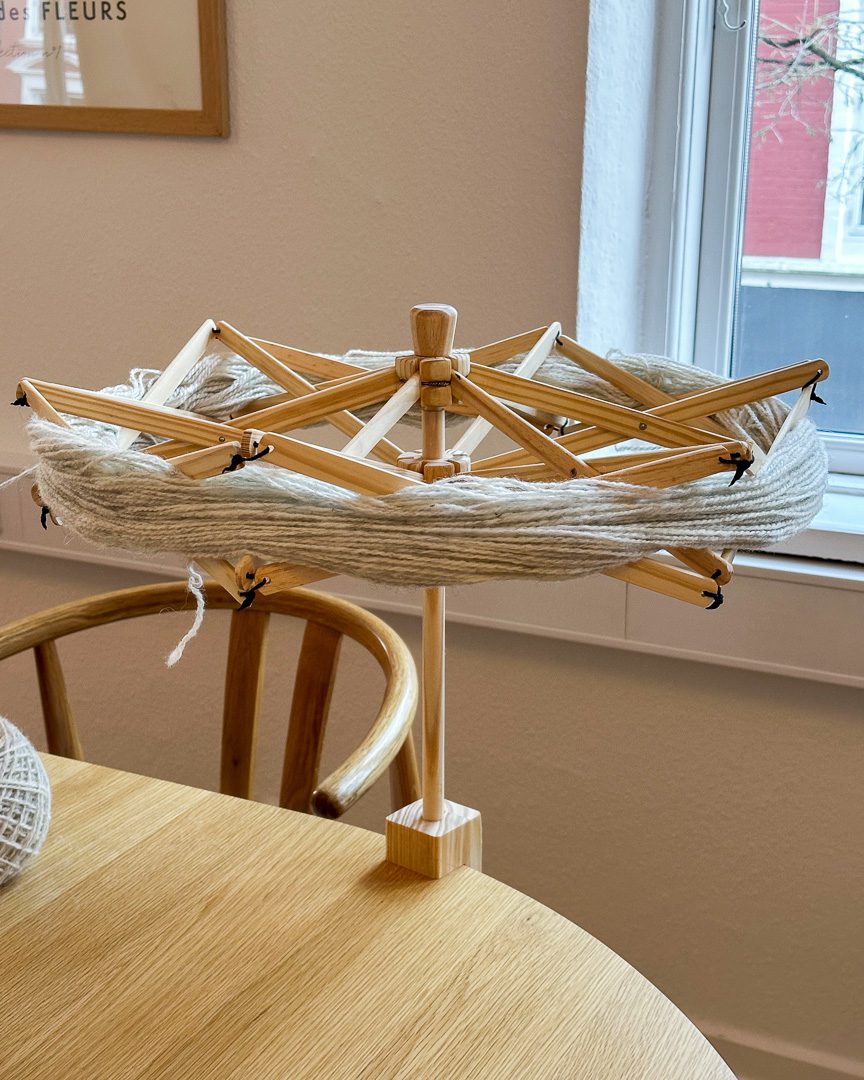 Garnvinde Mini spændes fast på en bordkant, en taburet eller en kommode. Når du åbner dit fed garn og lægger det om vinden, kan du nemt justere den, så garnet ligger godt og spændt. I brug måler vinden cirka 45 cm og kører helt frit, så opvindingen bliver både hurtigere og mere overskuelig. Den kræver meget lidt plads, er let at pakke sammen og gør det nemt at holde styr på garnet, uanset hvor du befinder dig.