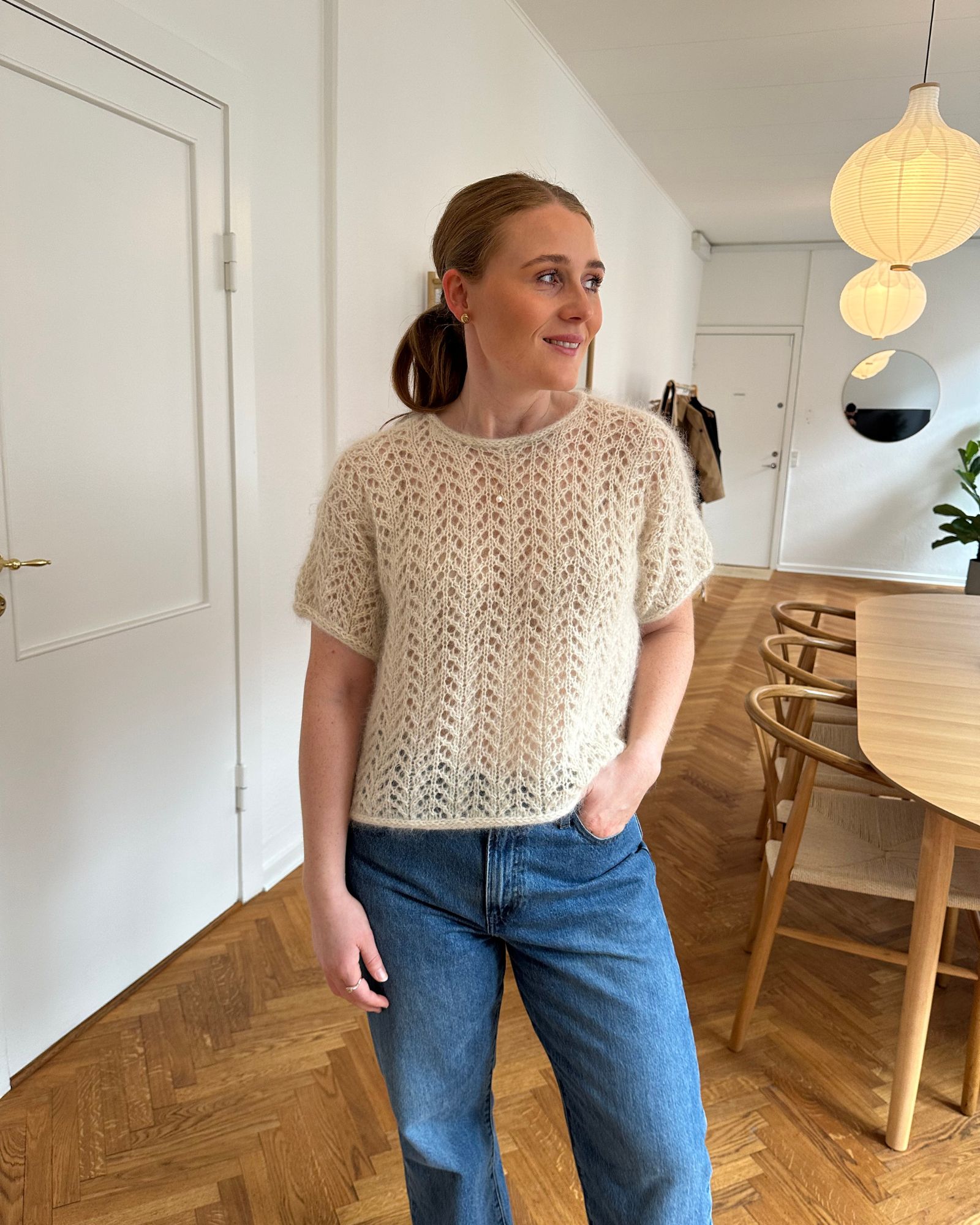5 (6) 6 (7) 7 (8) ngl Soft Silk Mohair fra Tante Grøn (70 % mohair, 30 % silke / 25 g = 210 m) strikkes sammen med enten 3 (4) 4 (5) 5 (5) ngl Bio Blomsterfrø fra Tante Grøn (100 % økologisk bomuld / 50 g = 178 m) eller 2 (2) 2 (3) 3 (3) ngl Tweed fra Tante Grøn (50 g = 350 m / 100 % uld).