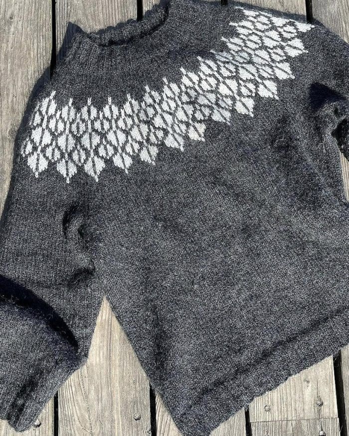 Trøjen strikkes nedefra og op. Først strikkes kroppen og ærmerne hver for sig, hvorefter de samles til det smukke bærestykke, der strikkes efter diagram.