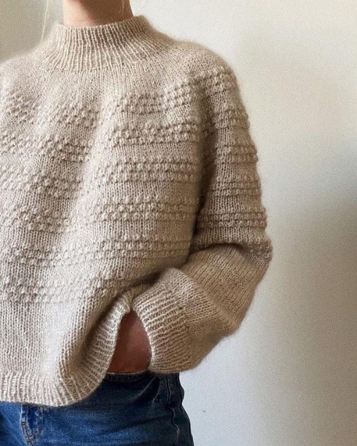 Ærmemaskerne sættes på en maskewire og hviler, mens kroppen strikkes til den ønskede længde og afsluttes med ribkant og Italiensk aflukning. Derefter strikkes ærmerne. Ærmerne er uden indtagninger. Maskeantallet reduceres inden ribkanten, der ligeledes afsluttes med Italiensk aflukning.