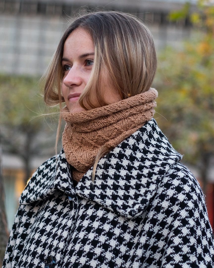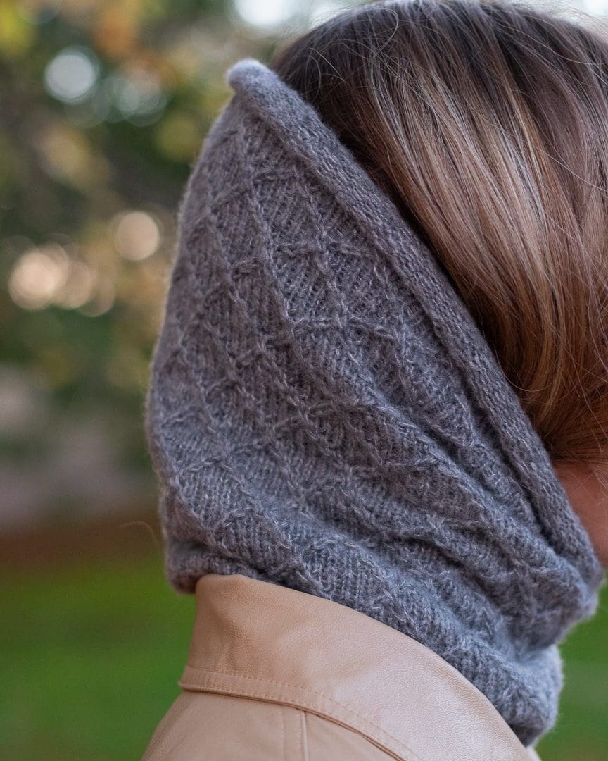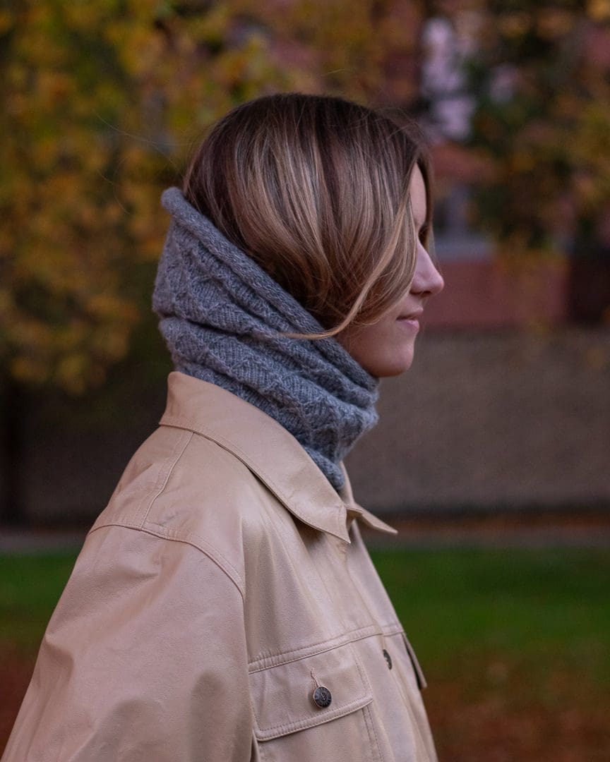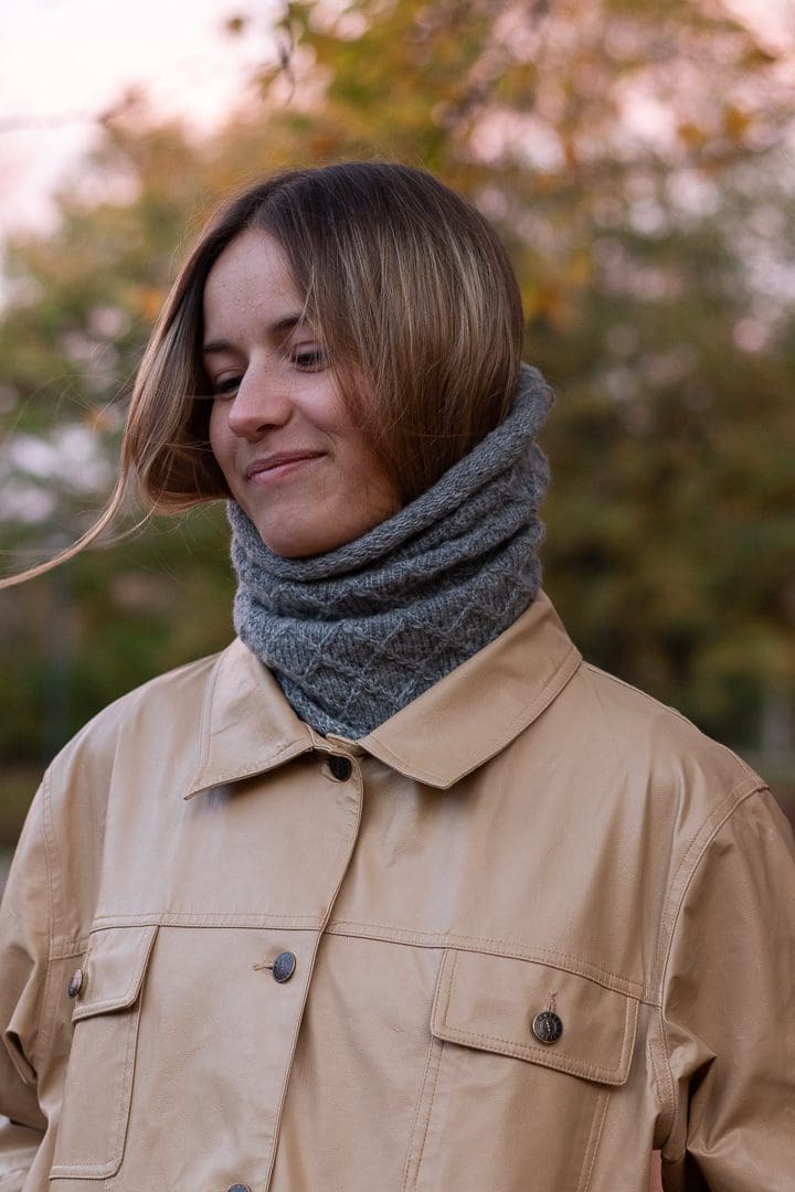 Haven collar is worked in the round on circular needle to form a tube. The Haven collar is worked in a fine diamond pattern which gives the collar a Nordic and feminine expression. The collar is a perfect substitute for a scarf and lays nicely around the neck, while providing warmth and shields from the cold wind.