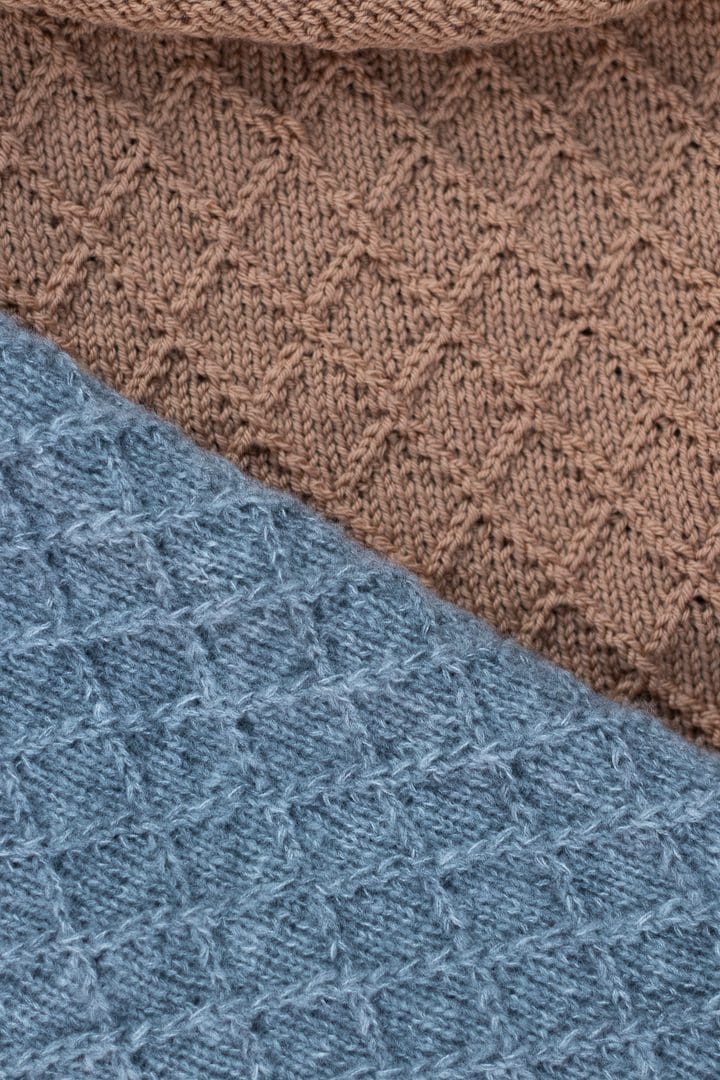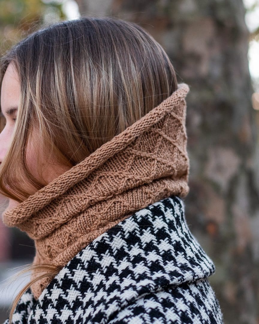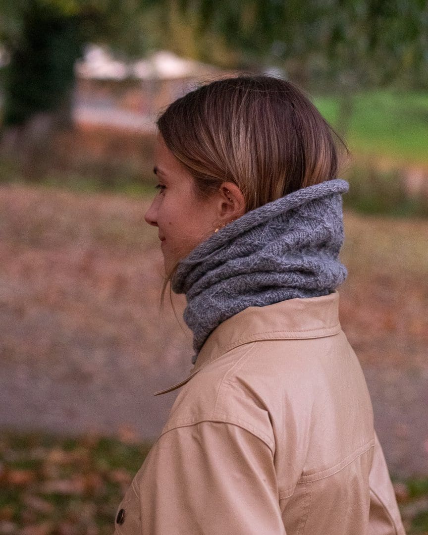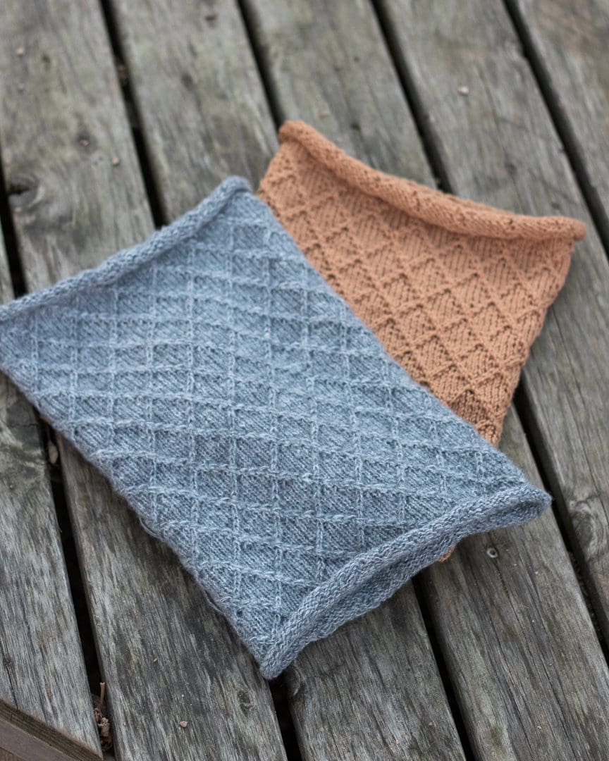 Haven collar is worked in the round on circular needle to form a tube. The Haven collar is worked in a fine diamond pattern which gives the collar a Nordic and feminine expression. The collar is a perfect substitute for a scarf and lays nicely around the neck, while providing warmth and shields from the cold wind.