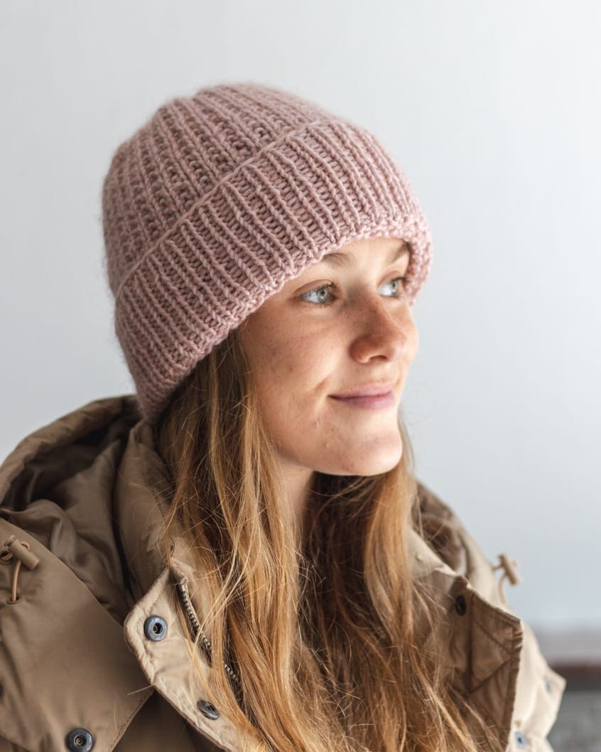 Hazel Hue er strikket i den lækreste kombi af blød, økologisk merinould og Silk Mohair. Udforsk de spændende farvespil ved at vælge forskellige farver i de to garnkvaliteter, eller vælg farver i samme nuance for et mere klassisk udtryk. Huen strikkes i perlerib, der giver et smukt enkel mønster, i Hazel farve 08 Blush og Tynn Silk Mohair farve 3511 Pudder Rosa.